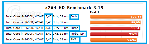 Das bedeutet du kannst x264 gar nicht als beispiel nehmen LOL - dafür kann ich auf Test2 (von x264) verweisen, der dir wiederspricht^^ Mit 2800 Ghz (@smt) ist der 2600k dennoch gleichschnell wie mit 3,4Ghz (ohne smt - mit Turbo und ohne) - das sind 600mhz (Plus Turbo). Noch viel schlimmer - schau wie der 2600 mit 2,8ghz absackt ohne smt. Im grunde hast du dich mit diesem beispiel - selbst abgeschossen.