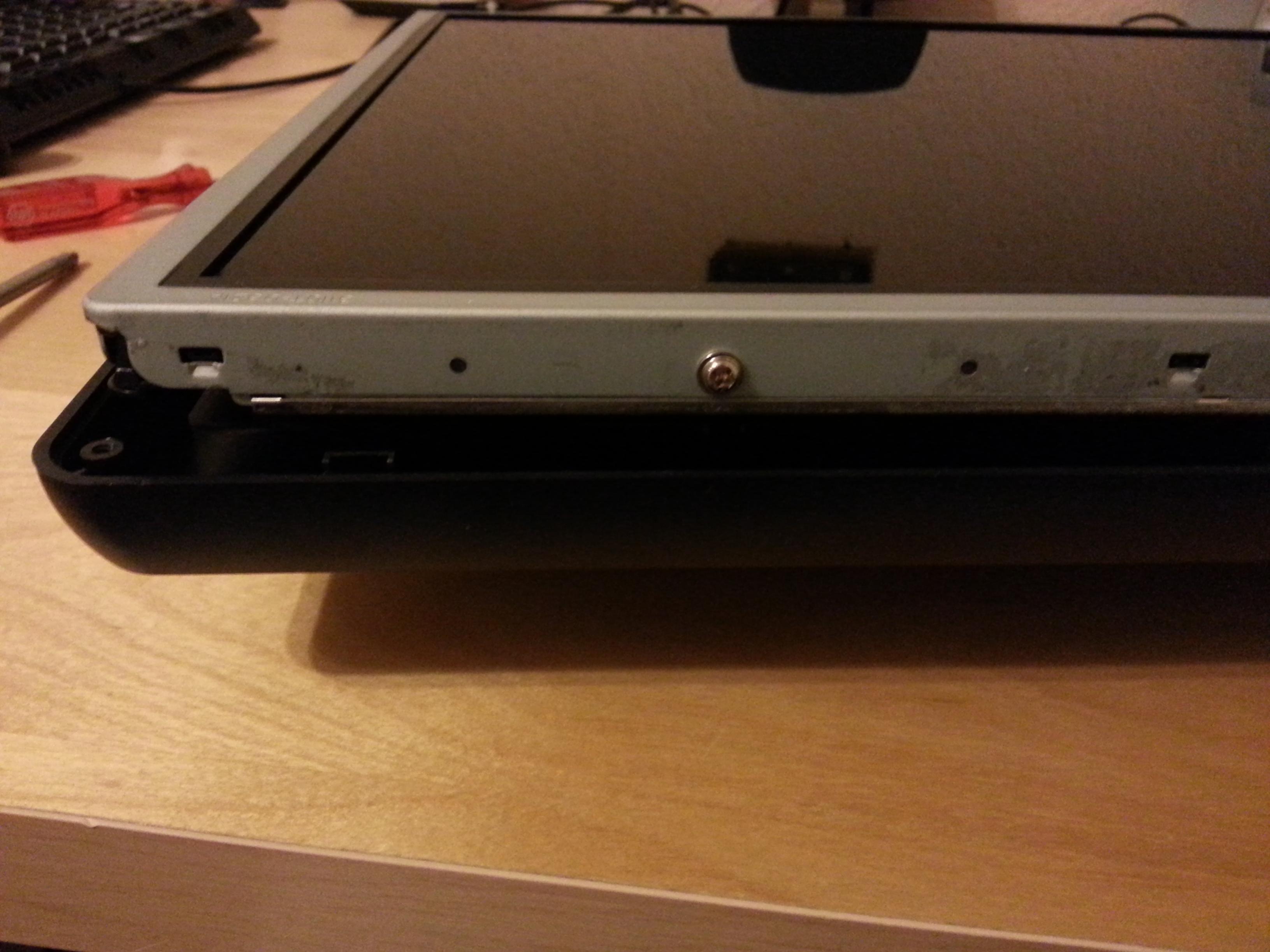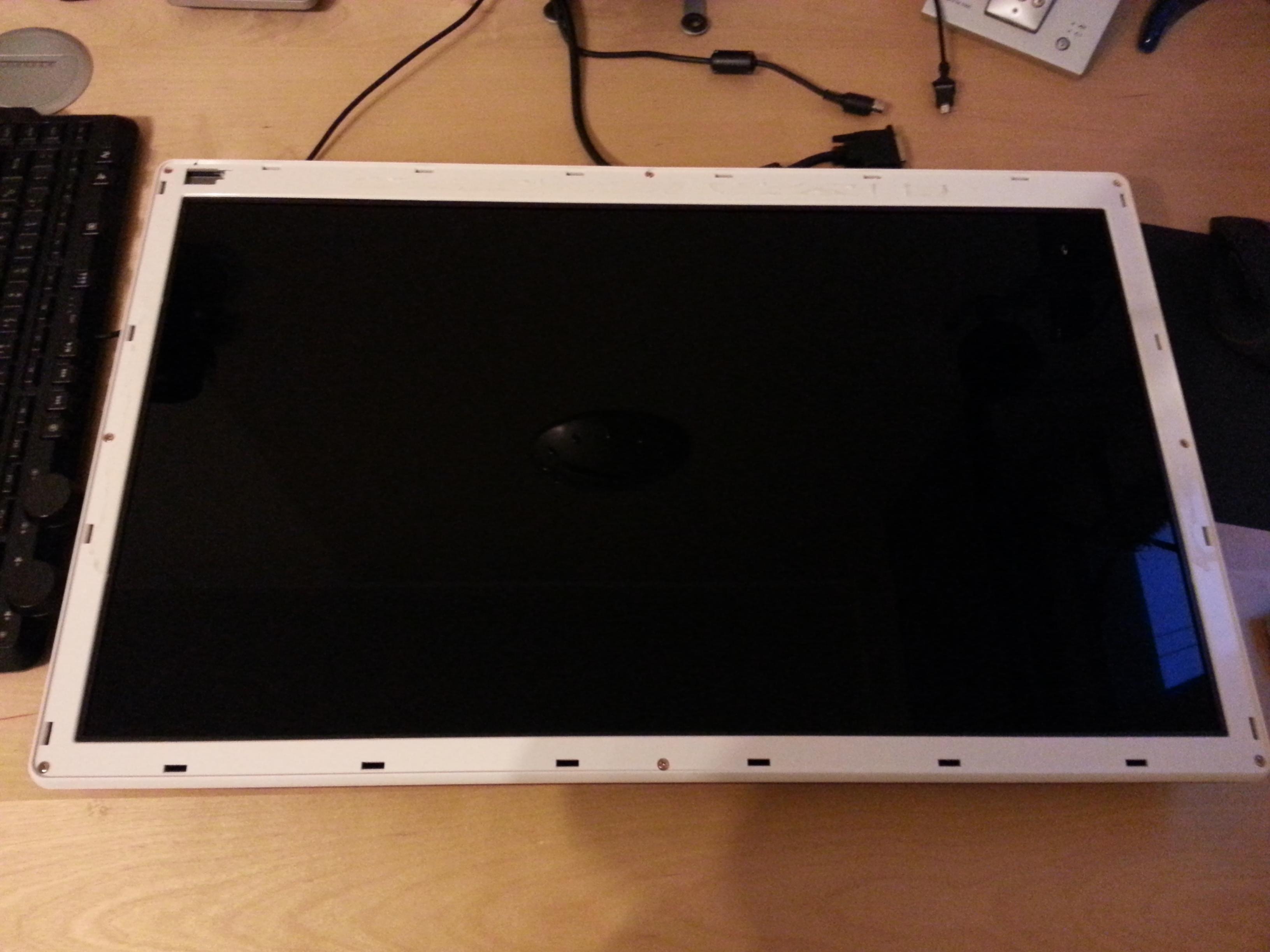 Um das ganze noch mal etwas ausführlicher zu beschreiben. Zuerst nimmt man die schwarze Blende ab. Diese ist zum einen gesteckt und in kleinen Teilen mit doppelseitigem Klebeband an den weißen Rahmen geklebt. Um die schwarze blende abzubekommen muss man von der Innenseite (also vom Panel her) unter die Blende kommen und kann diese dann einfach nach oben herrausklacken. Ich würde empfehlen oben anzufangen weil der Rahmen an der Unterseite mit dem weißen Rahmen verklebt (nur das Klebeband) ist.