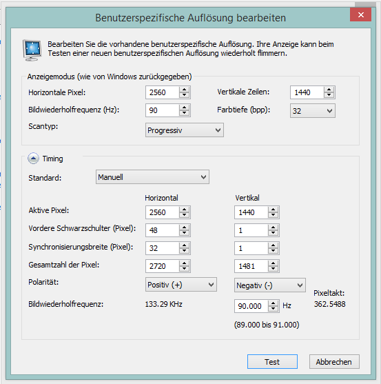 Beim Übertakten erreiche ich momentan max. 108 Hz, drüber geht zwar, aber dann tauchen an zwei Stellen komische Farbveränderungen auf. Mit manuellen Timings lässt sich evtl. noch was rausholen. Der bekannte Test bestätigt, dass kein Frame Skipping auftritt.