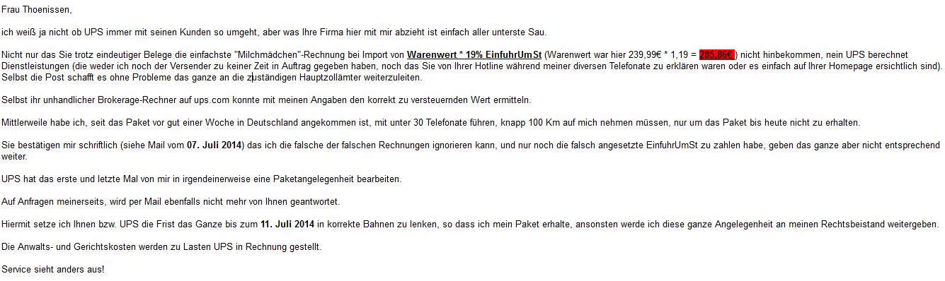 Ich habe UPS nicht mit der Einfuhr beauftragt, also können die auch nicht verlangen von mir, nicht näher benannte "Brokerage"-Kosten zu tragen. (Frechheit das die mir MwSt auf eine Dienstleistung anrechnen wollten)