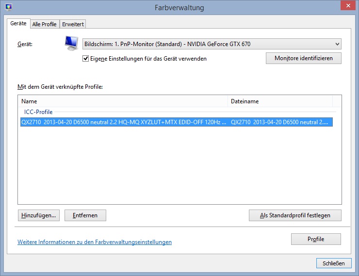 Also ich verwende das Farbprofiel für die 110Hz von Yasamoka ICM profiles und bin eigentlich recht zufrieden damit. Ich habe das Bild noch über das Catalyst Control Center etwas heller gestellt (Gamma auf 1,25 und Kontrast auf 105)