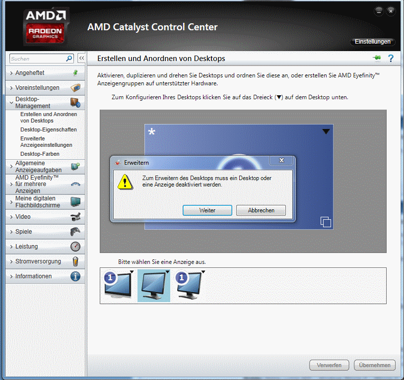 Schön und gut heute kam dann das DisplayPort --> HDMI Kabel und ich habe dann noch den Fernseher an meine Grafikkarte angeschlossen. Habe dann ein bischen in den Windowseinstellungen (Bildschirmauflösung) rumgespielt und habe festgestellt ,dass immer nur 2Geräte funktionieren und aktiv benutz werden können...