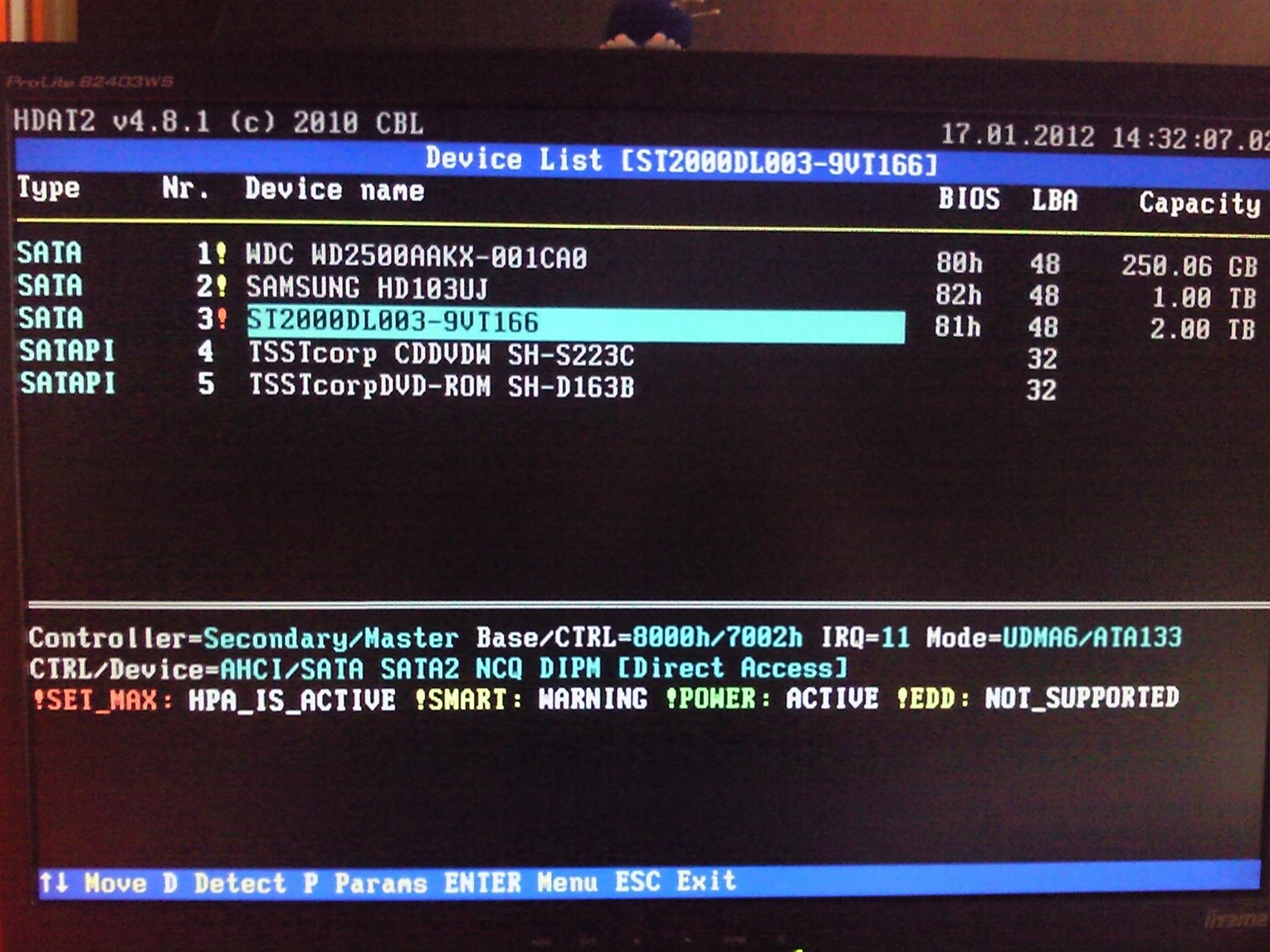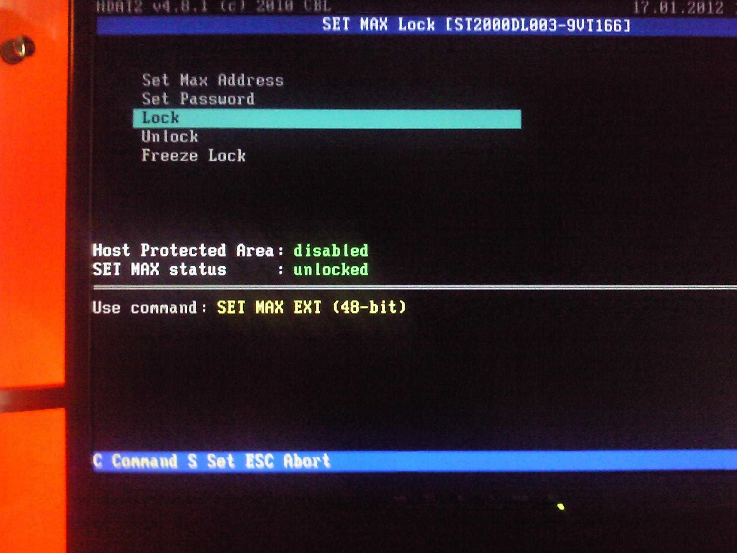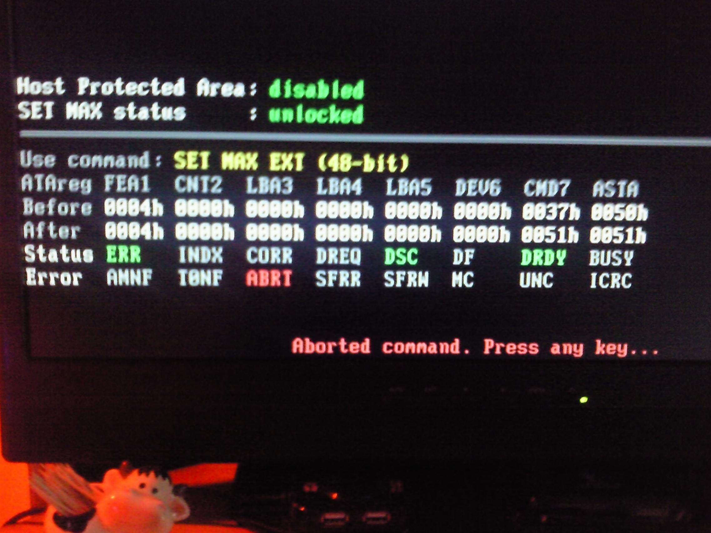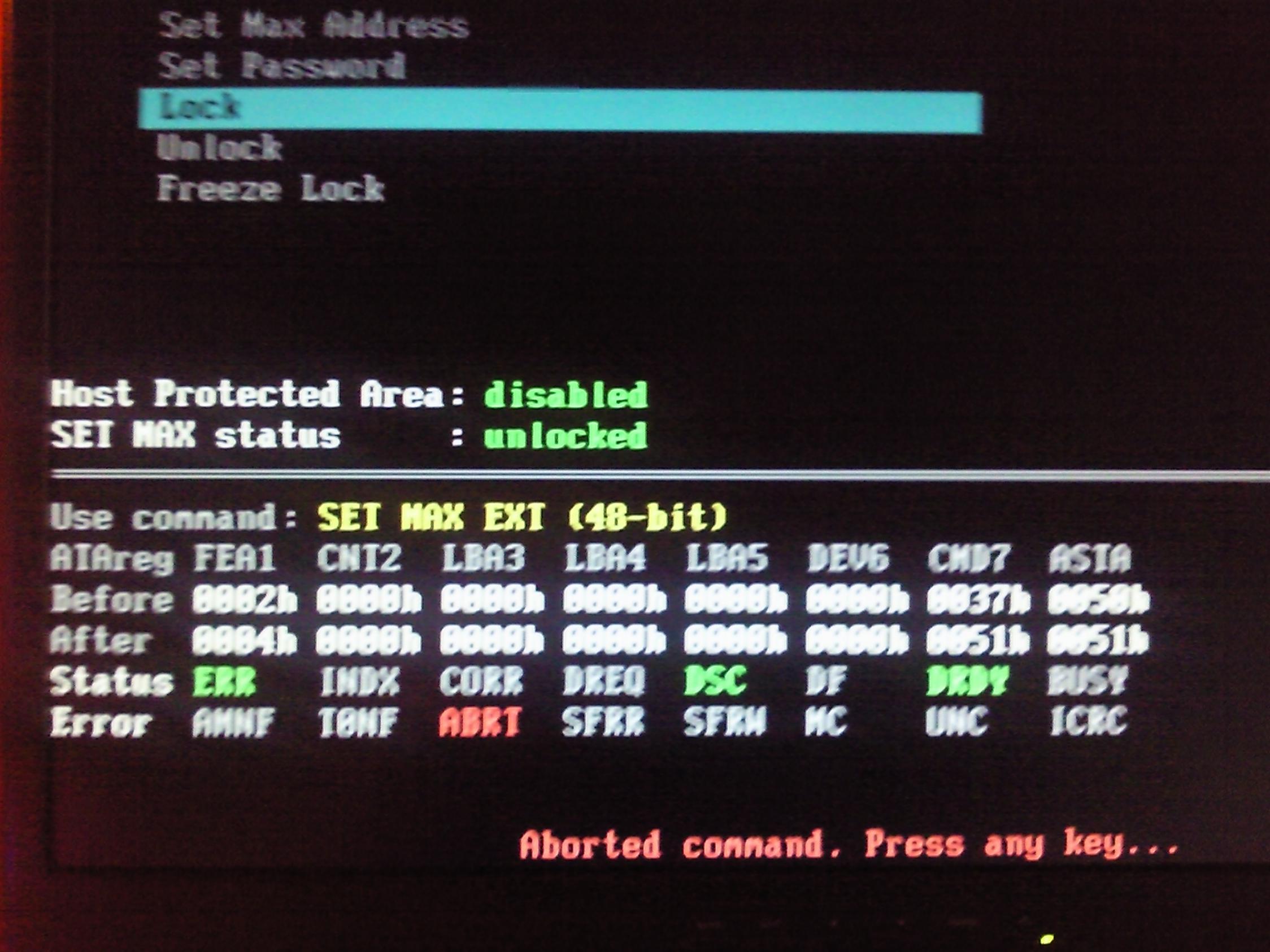 Das haben wir jetzt unterbunden, indem wir selbst eine HPA von 512Bytes (1 Sektor, der verschmerzbar ist) angelegt haben.