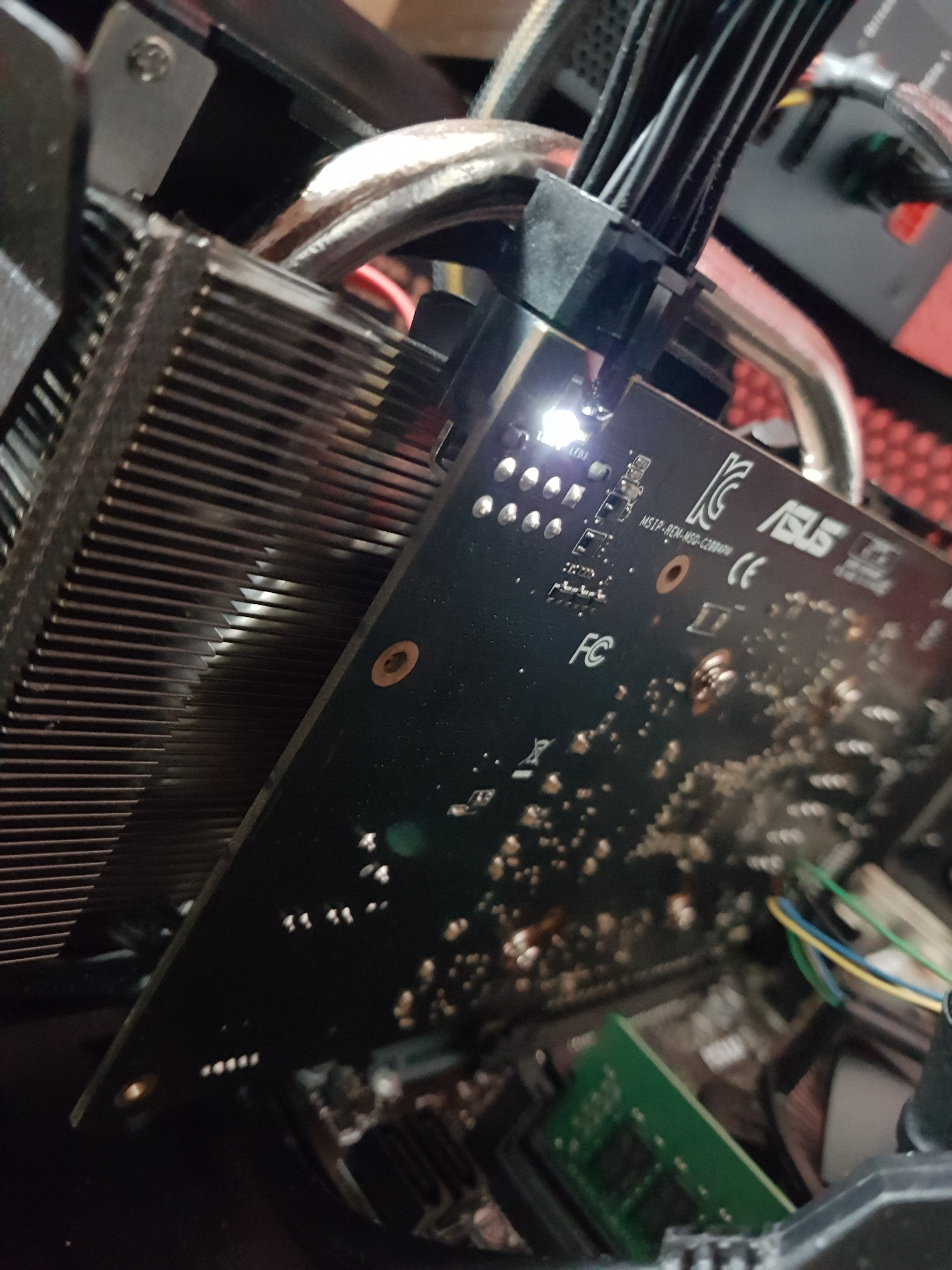 Grafikkarte eingebaut, Die LED zeigt LED 1 an (siehe Fotos) und wenn ich den PC starte bleibt der Bildschirm schwarz. Die Lüfter aber drehen auf und bewegen sich. Wenn ich das Stromkabel von der Karte ziehe, wird die LED rot.