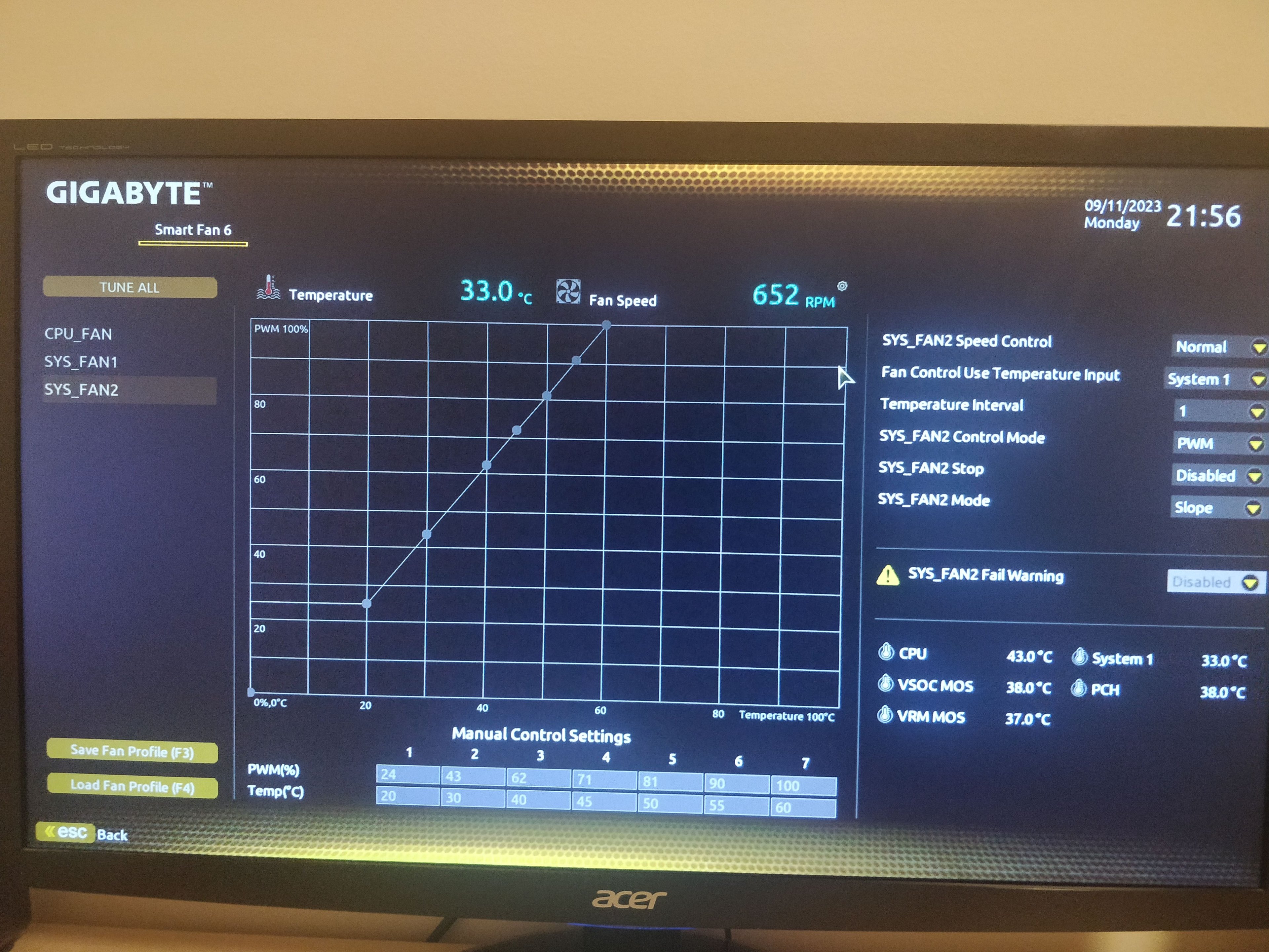 In den Lüftereinstellungen im BIOS habe ich schon herumprobiert, aber auch wenn ich die Einstellung von Auto auf PWM oder irgendeine andere ändere, ändert sich nur die Geschwindigkeit des schon aktiven Lüfters.