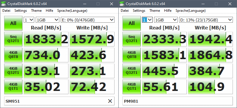 Die PM981 erreicht bei mir nur 1093Mb/s (3000Mb/s Hersteller), die SM951 nur 1226Mb/s (2200Mb/s Hersteller), komisch auch dass die SM951 als SATA6 Schnittstelle erkannt wird, aber trotzdem mehr als 600MB lesen/schreiben kann