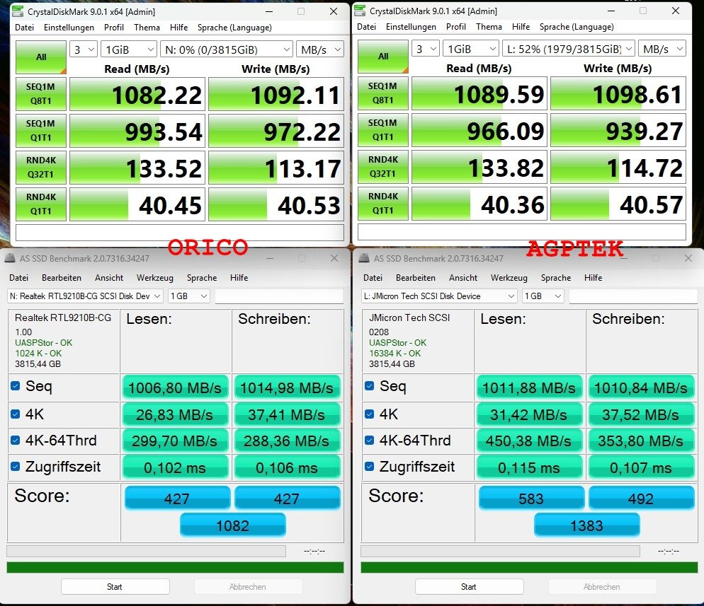 Wenn ich normale Benchmarks mache (CrystalDiskMark und AS SSD Bench), sind die Werte bei beides Cases ziemlich gleich. Wenn ich aber in dem Programm "MiniTool Partition Wizard" einen Oberflächentest mache, kommen massiv unterschiedliche Werte raus. Sprich: das eine Case ist mit ca. 5500 MB/min (ca. 92 MB/s) geradezu schneckenlangsam im Vergleich zu dem anderen Case mit ca. 73000 MB/min (ca. 1216 MB/s). Und das spiegelt sich auch genauso in der Dauer des Test wider.