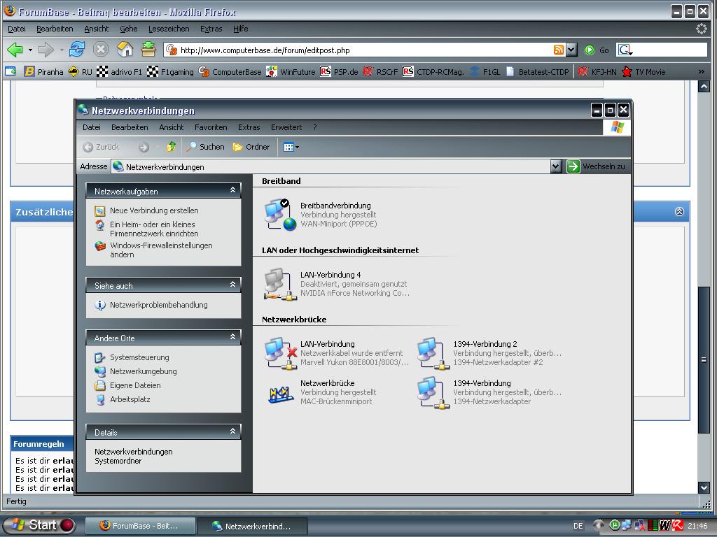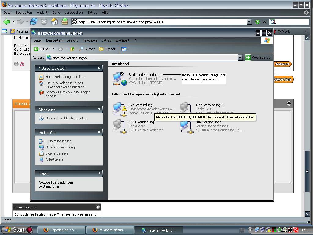 Ich hab Problemm und komme nicht mehr weiter.Ich hab 2 Rechner mit Winprof, beide Rechner hab ich schon miteinander verbunden.Ein Rechner hängt am internet da ich 2 Netzwerkanschlüsse habe, geht das auch ist ein Asus An8 Sli Premium.