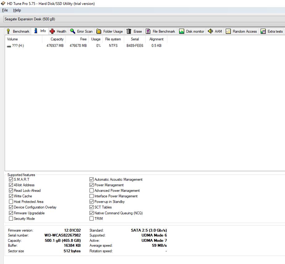 Beim Testprogramm HD-Tune wird bei dieser Platte ständig ein anderer Name angezeigt; statt der WD-Platte wird eine Seagate-Platte aufgeführt.