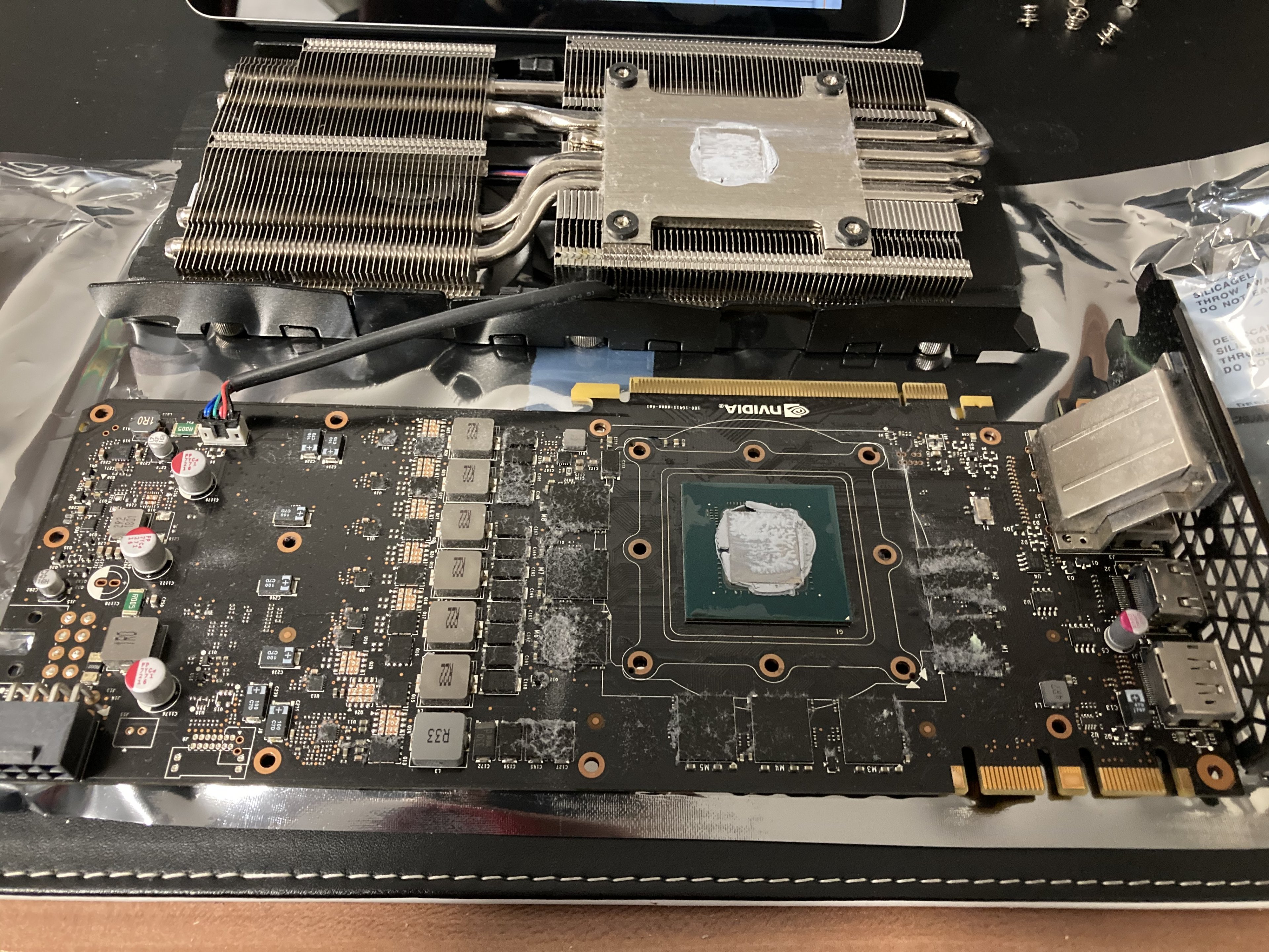 Dann kam der alte Luftkühler von der Grafikkarte ab; ganz schöne Sauerei mit der Wärmeleitpaste: