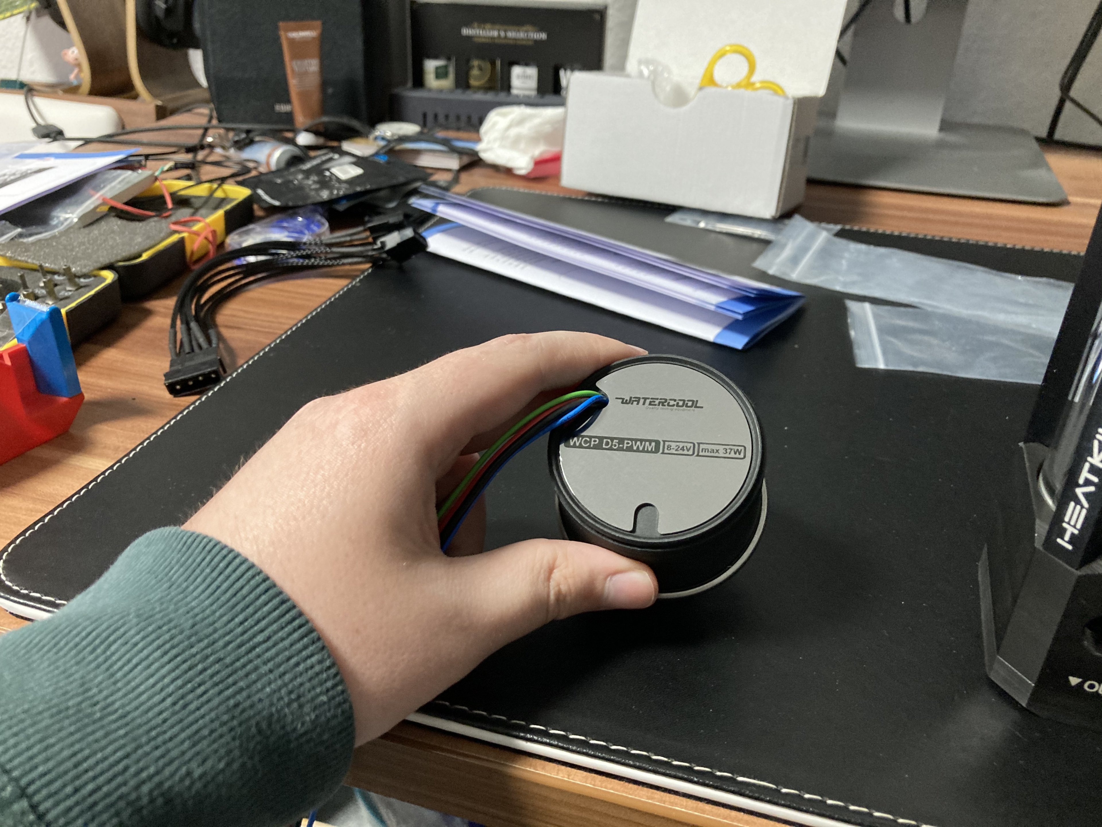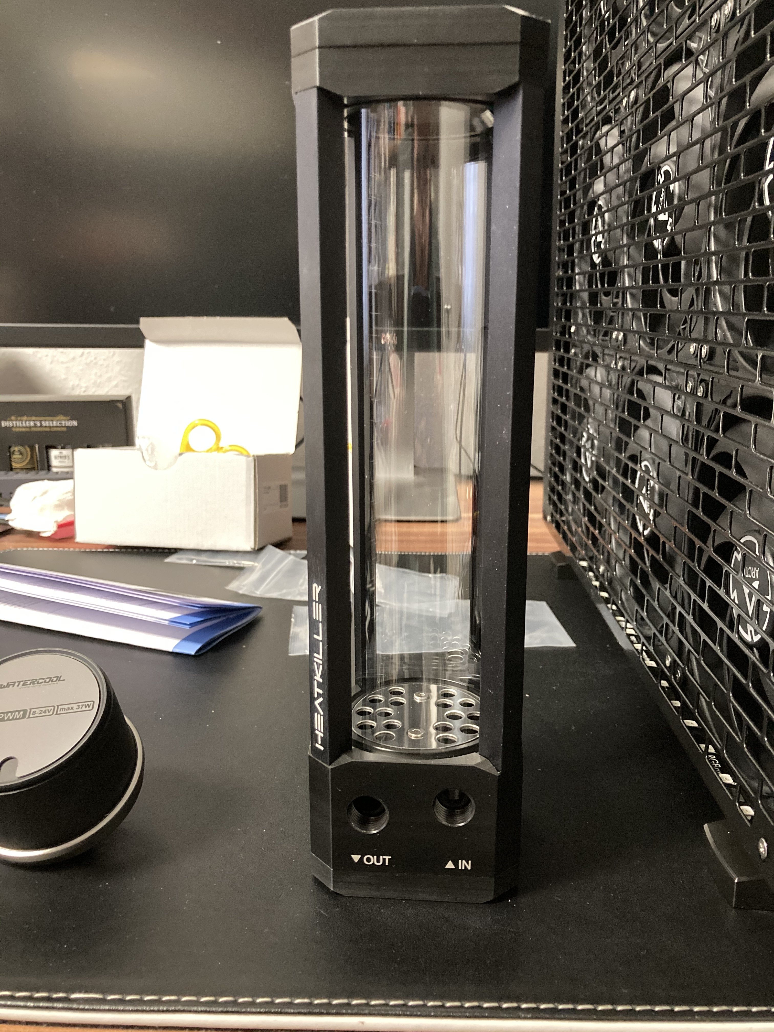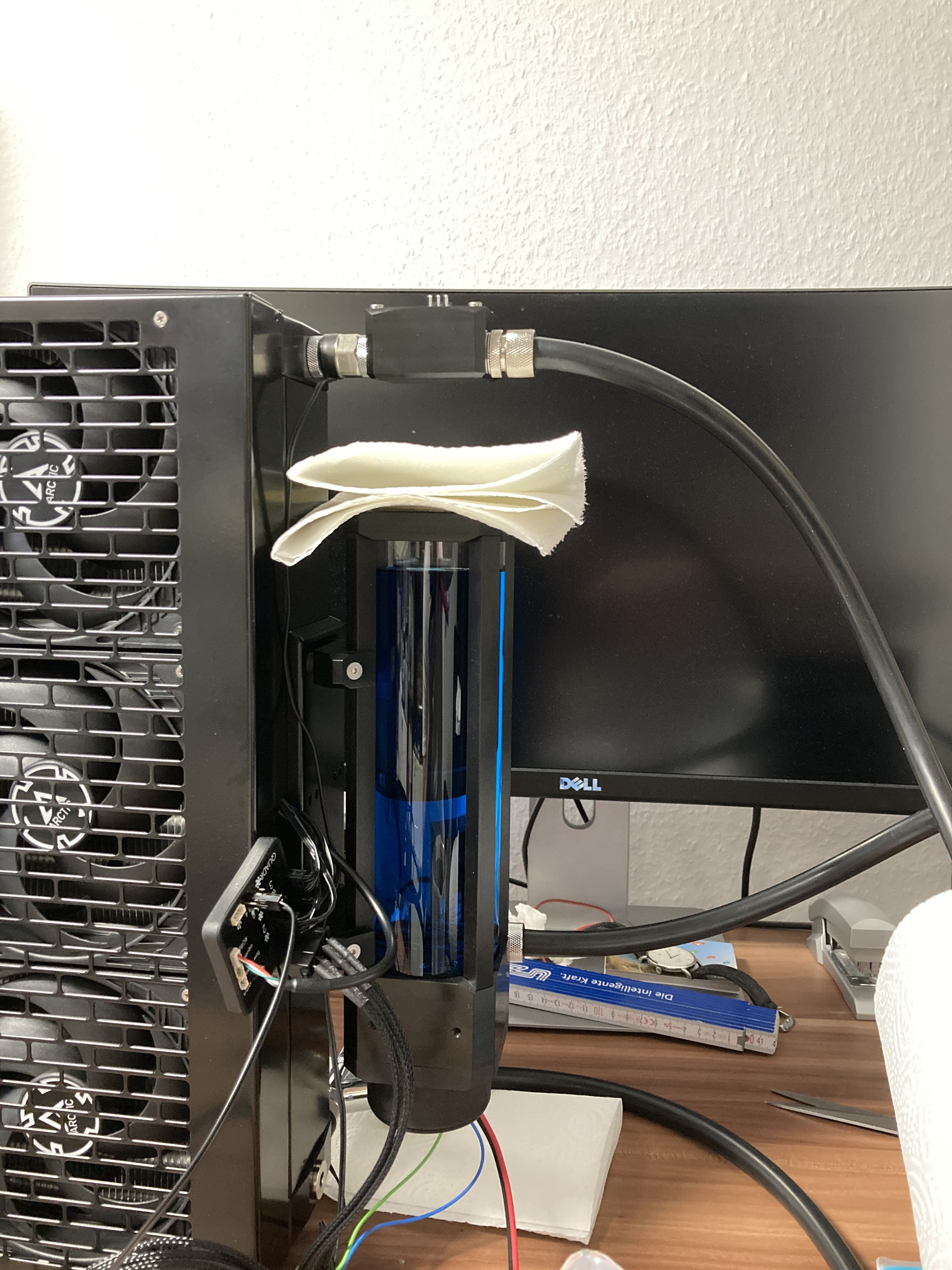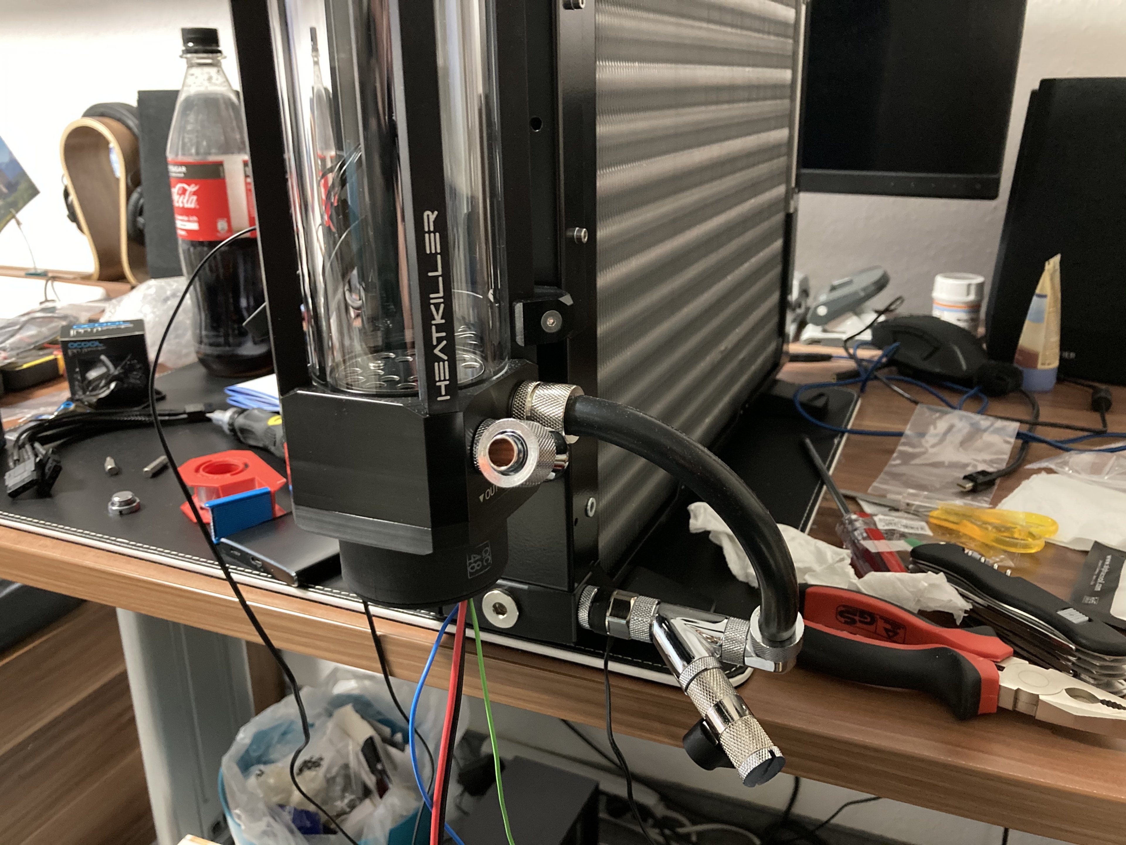In den folgenden Beiträgen seht ihr, wie meine Planung ursprünglich aussah. Kurz zusammengefasst: Im Gehäuse befinden sich nur die Kühlkörper, der Rest ist extern. Am MO-RA ist das HEATKILLER Tube befestigt, an dem wiederum die D5-Pumpe befestigt ist.