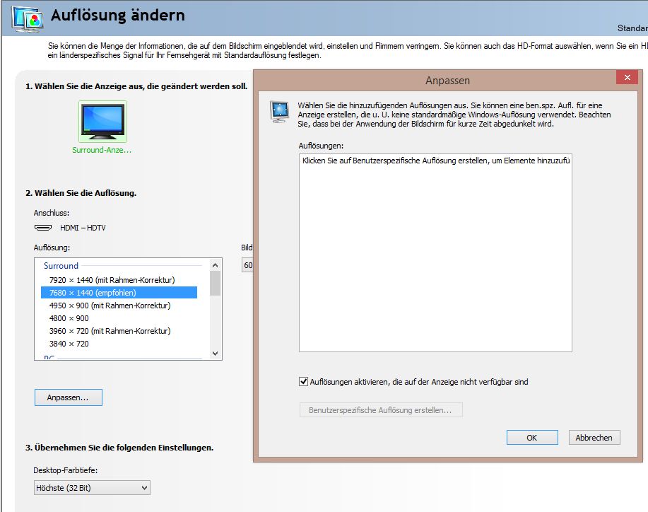 Hier vermisse ich nun vorallem die 5760 x 1440 Auflösung. Unter "Anpassen" kann ich auch keine Benutzerspezifische Auflösung erstellen, der Button ist einfach ausgegraut (eventuell ist das ja standardmäßig so, wenn NV Surround aktiviert ist):