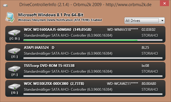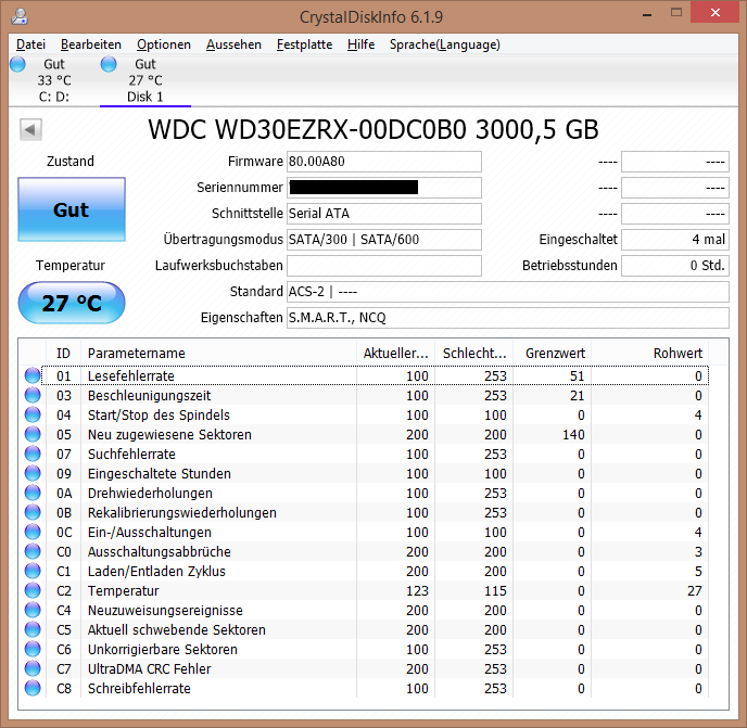 ChristalDiskInfo zeigte bei den Platten A und B folgendes an: