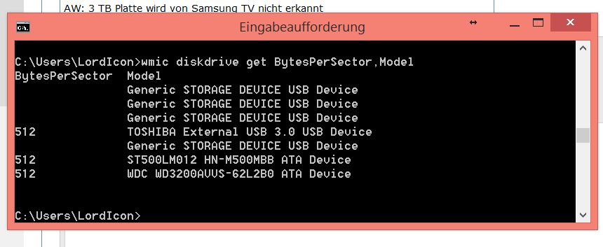 Die 3 TB Platte, die von deinem TV erkannt wird, nutzt offenbar 4K-Sektoren, bzw. der Bridge-Chip emuliert 4K-Sektoren. Überprüfen kannst du das, wenn du die externe Platte an deinen PC anschließt, die Eingabeaufforderung öffnest und folgenden Befehl eingibst: wmic diskdrive get bytespersector,model