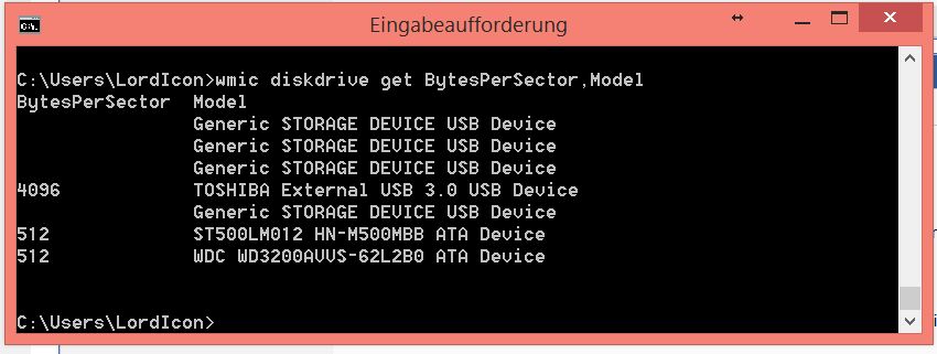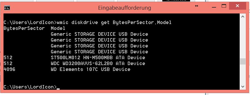 Wird als Ergebnis bei der externen Platte 4096 angezeigt, ist die 4K-Sektoremulation im Spiel. Was anderes würde mich stark wundern, da der MBR bei einer Sektorgröße von 512 Bytes maximal 2,2 TB pro Platte verwalten kann.