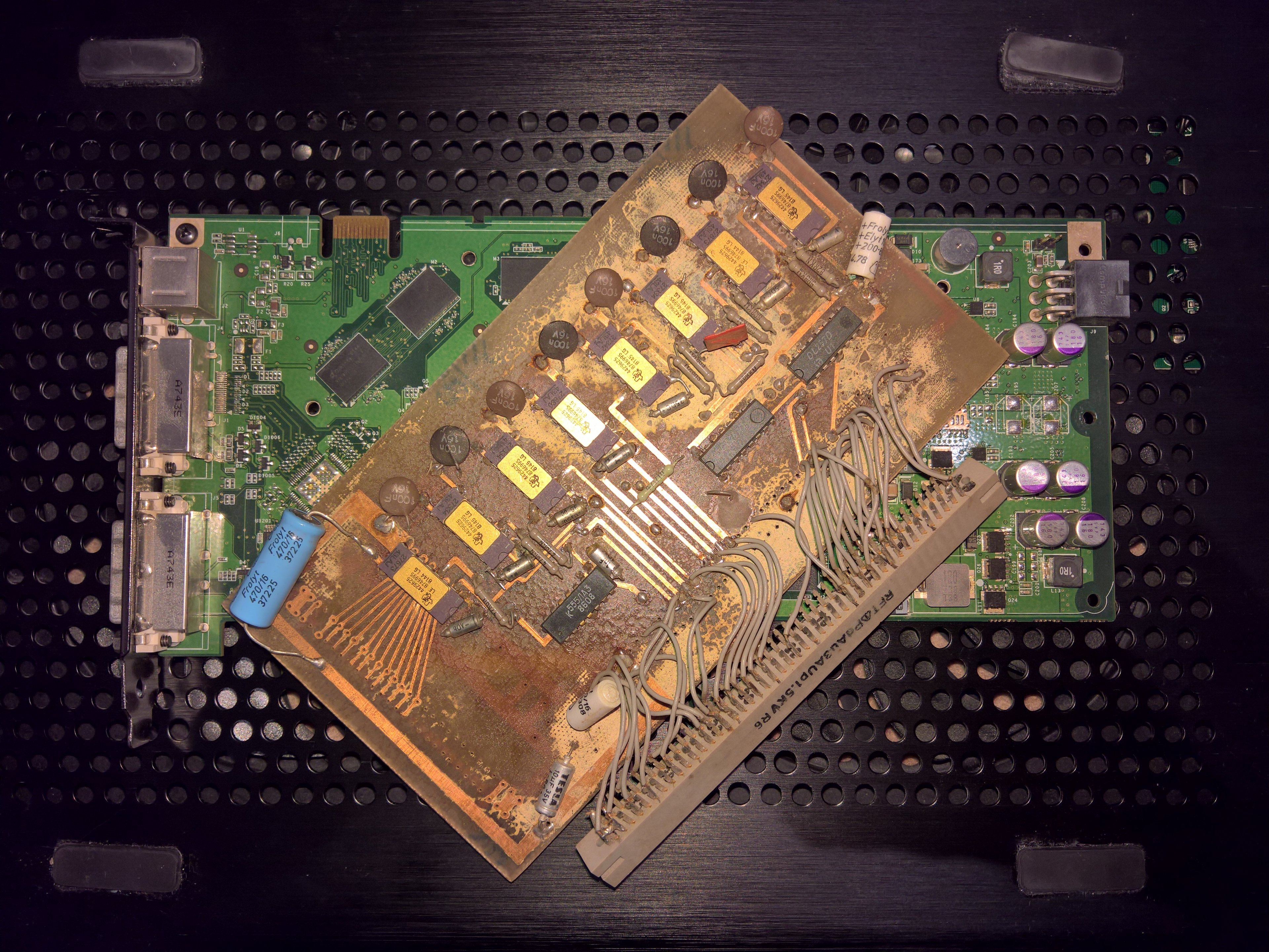 Nur weil ein bisschen Grünspan an dem Frolyt-Elko im Plastikgehäuse ist? Nö, die ganze Platine ist von einer Säure bzw. Salzen zerfressen - und daher stammt auch der grünliche Belag am linken Anschlusspin. Das Metall ist oxidiert.