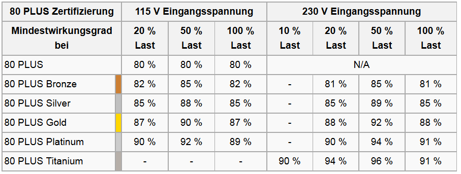 Und wenn ein Hersteller das 80plus Bronze Siegel an ein Gerät ran tackert, dann spezifiziert er die Effizienz bei 20/50/100% auf 82/85/82%.