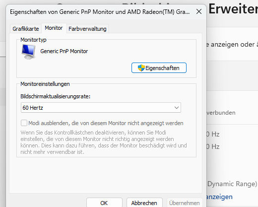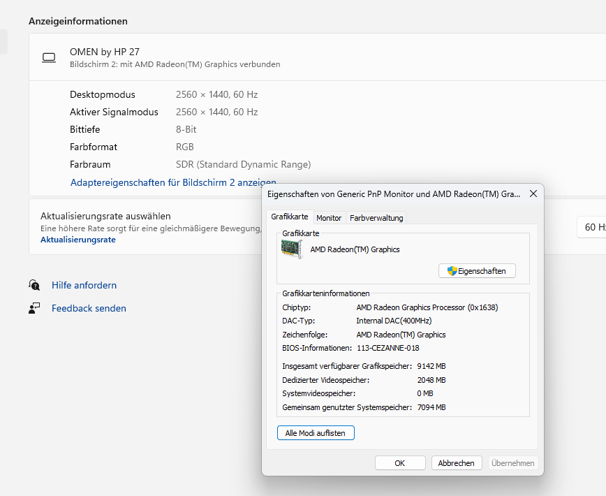Lenovo Ideapad Gaming 3 mit o.g. Hardware wurde an den Monitor angeschlossen, das Bild wird nur auf dem HP Omen 27 angezeigt, welcher mit dem identen HDMI Kabel sonst mit allen anderen Systemen 1440p mit 144Hz packt, nur hier sitze ich bei 1090p und 60Hz fest, trotz aktueller Treiber für die integrierte APU und die 3060, was kann ich da noch tun?