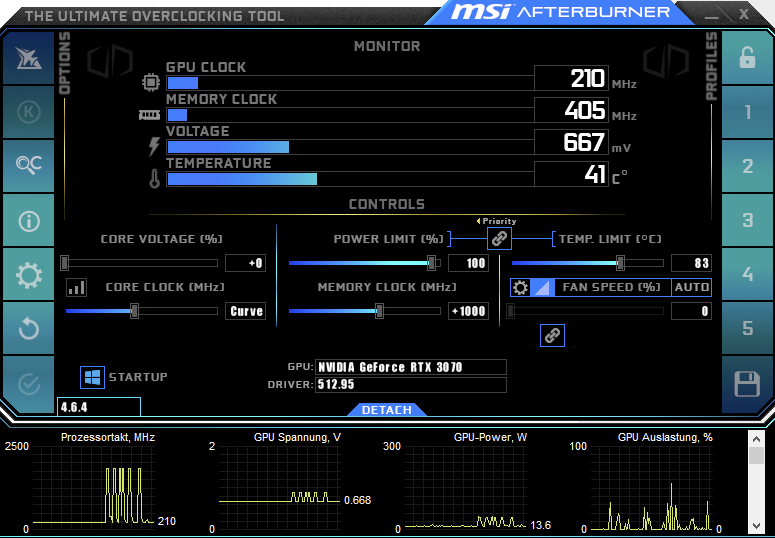 - In den Settings im Afterburner "Erzwinge Lüftergeschwindigkeitsupdate..", "Override zero fan speed", "Use firmware control mode" in diversen Kombinationen durchgetestet: Ohne Effekt.