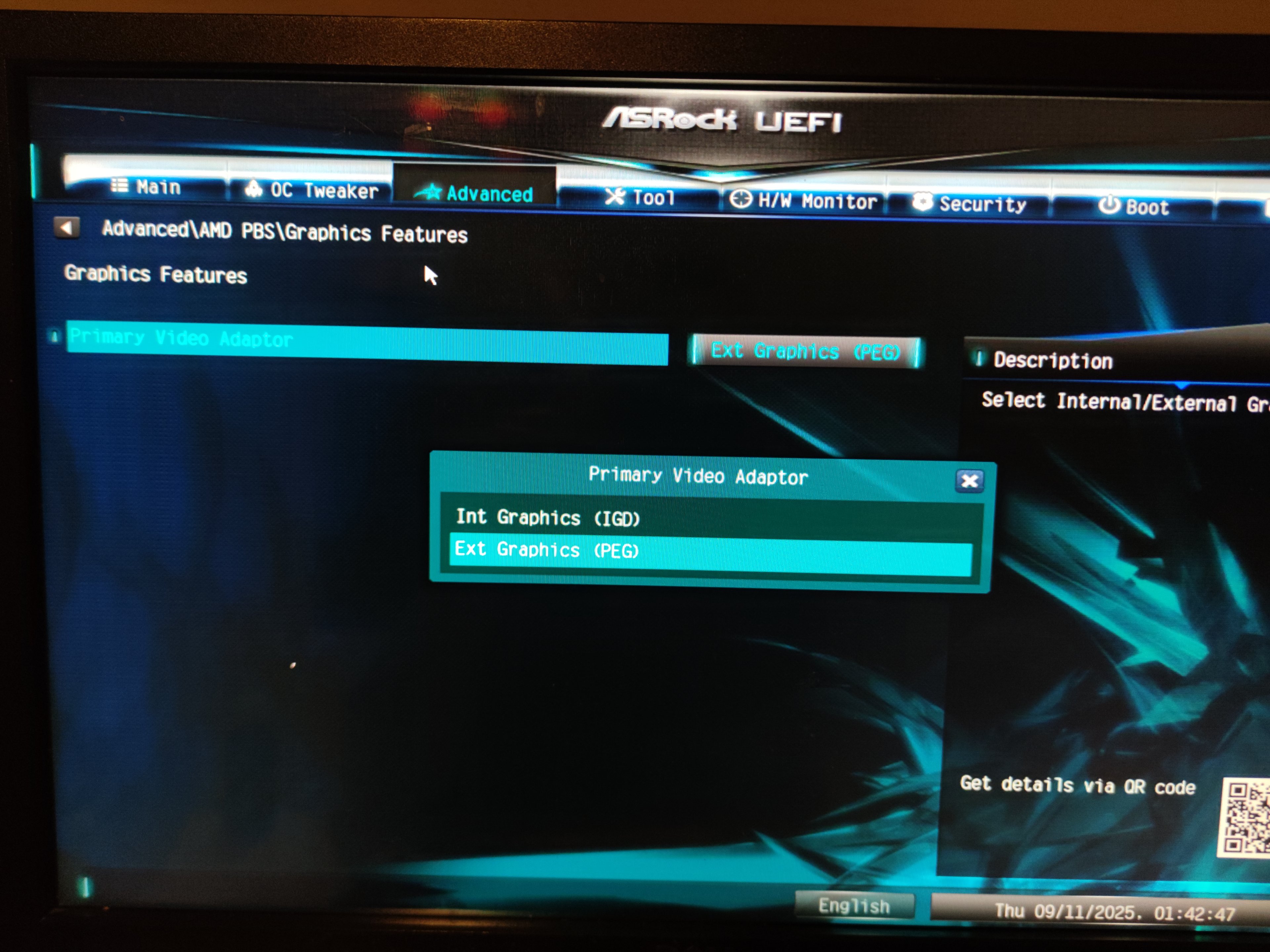Ich nutze die IGPU der CPU möchte aber aufgrund von Troubleshooting eine HD5450 einbauen. Die Grafikakrte ist funktionsfähig, in anderen System getestet . Aber es wird immer die IGPU genutzt (keine Grafikausgabe über HDMI auf der Grafikkarte). Trotz der im Screenshoot getätigt einstellungen. Hat jemand eine Idee?