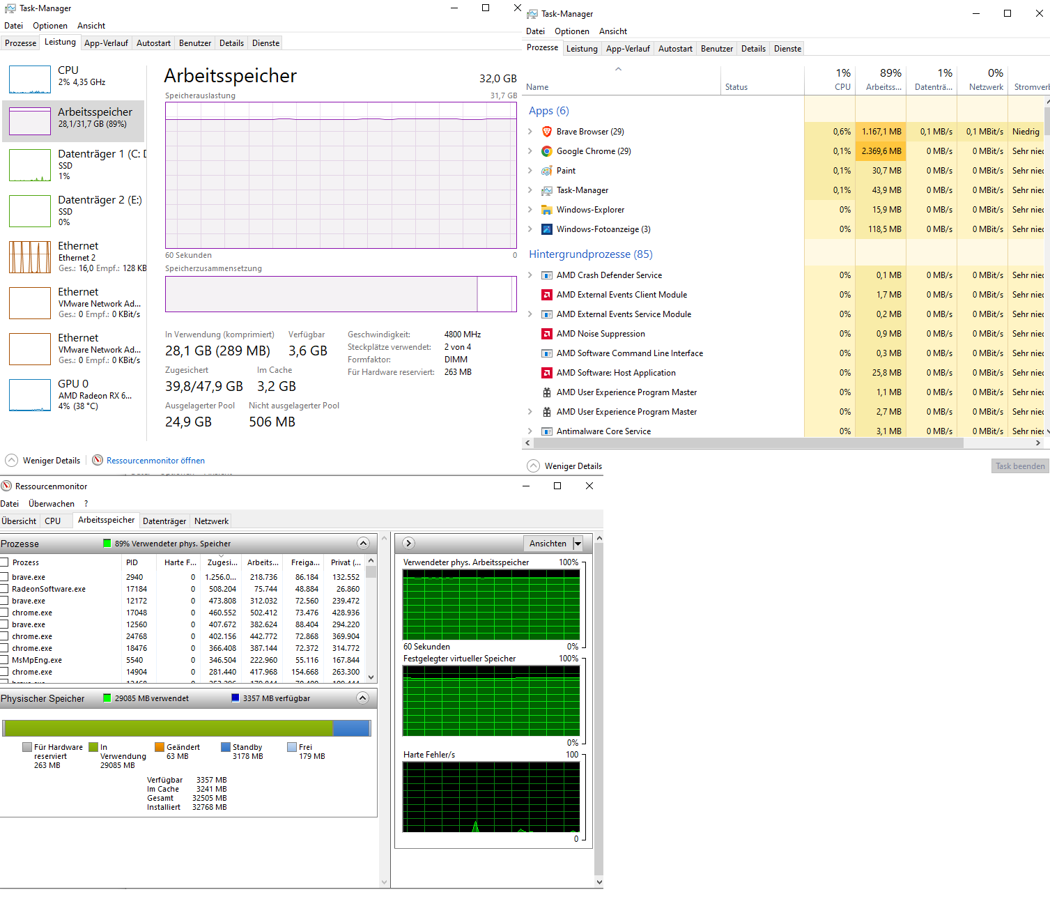 Nach einen Neustart und öffnen der genau gleichen Tabs(speichert er sich) sind nur 11GB belegt. Was macht Windows mit meinen Speicher? Dieses Phänomen ist mir vor einer Woche aufgefallen, vor ein paar Monaten war das definitiv nicht so. Das er etwas voller wird ja, aber bei weiten nicht so stark. Nachdem Startprozess hat er 6GB belegt mit geöffneten Browsern 11GB. Im Laufe des Tages hatte sich dies damals auf 15-16GB erhöht, obwohl ich nur gesurft habe. Dachte mir das es Dateien sind, die im Laufe des Betriebs dazukommen. War ja völlig OK. aber 28GB? Was ist passiert? Habe auch seit Monaten kein Programm oder ähnliches installiert.