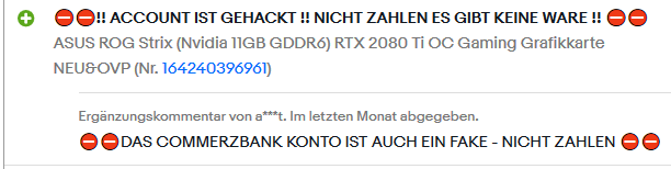 Gehackter Account, hab die Anzeige gefunden. Sieht man sofort wenn der sonst nur anderes verkauft hat und plötzlich GPUs, ist schon sehr auffällig. Zudem heißt der Wendeschneidplatten das ist Industrie Zubehör.