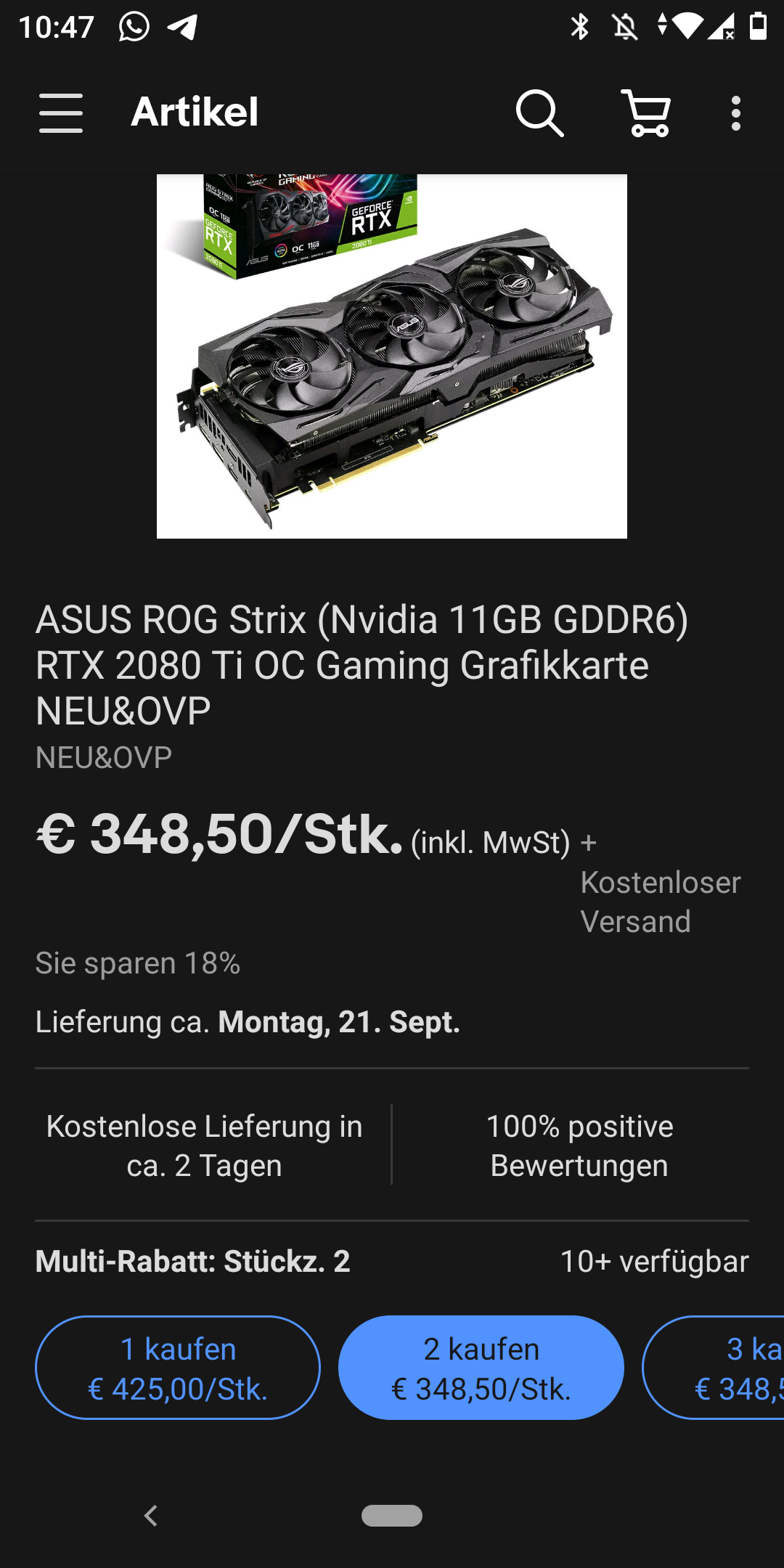 ich wollte mir eigentlich eine 3070 kaufen, sehe aber auf Ebay gerade einen Verkäufer, der neue 2080tis (Asus ROG strix) verscherbelt. Einzeln für 425€ und wenn man zwei kauft(wer hat lust sich eine mit mir zu kaufen?) für 350€ das Stück.
