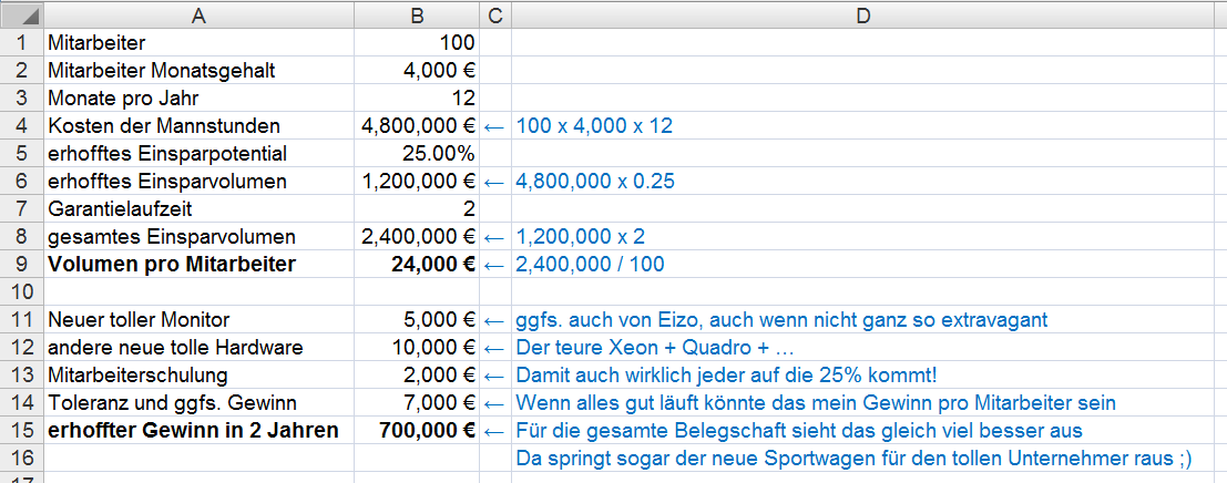 Als Beispiel: Wenn ein Unternehmen mit 100 Ingenieuren in einer primär computergestützten Arbeitsumgebung durch effizientere Hardware die Mannstunden um 25% senken kann, dann macht das eventuell einen beachtlichen Gewinn aus, selbst nach Tätigung von sehr kostspieligen Investitionen. Siehe dazu mein kleines Rechenbeispiel im Anhang.