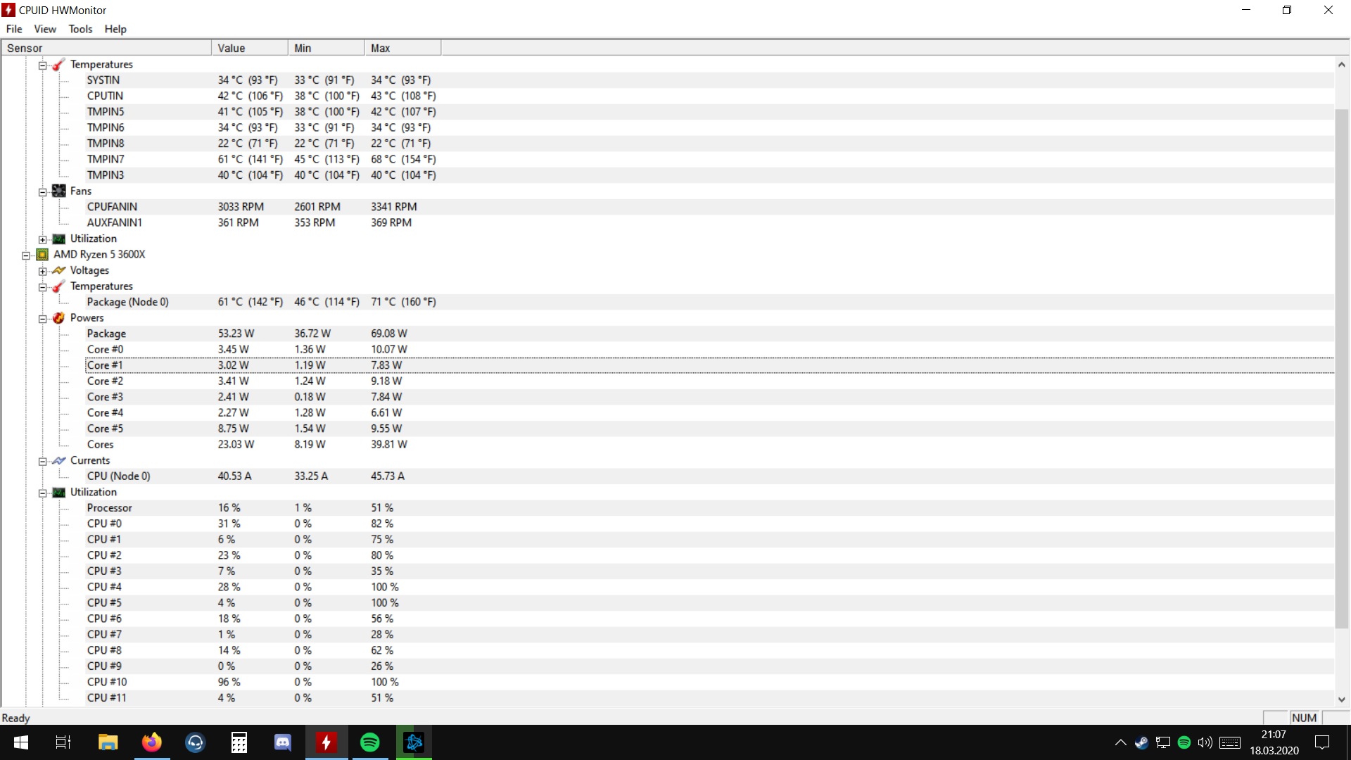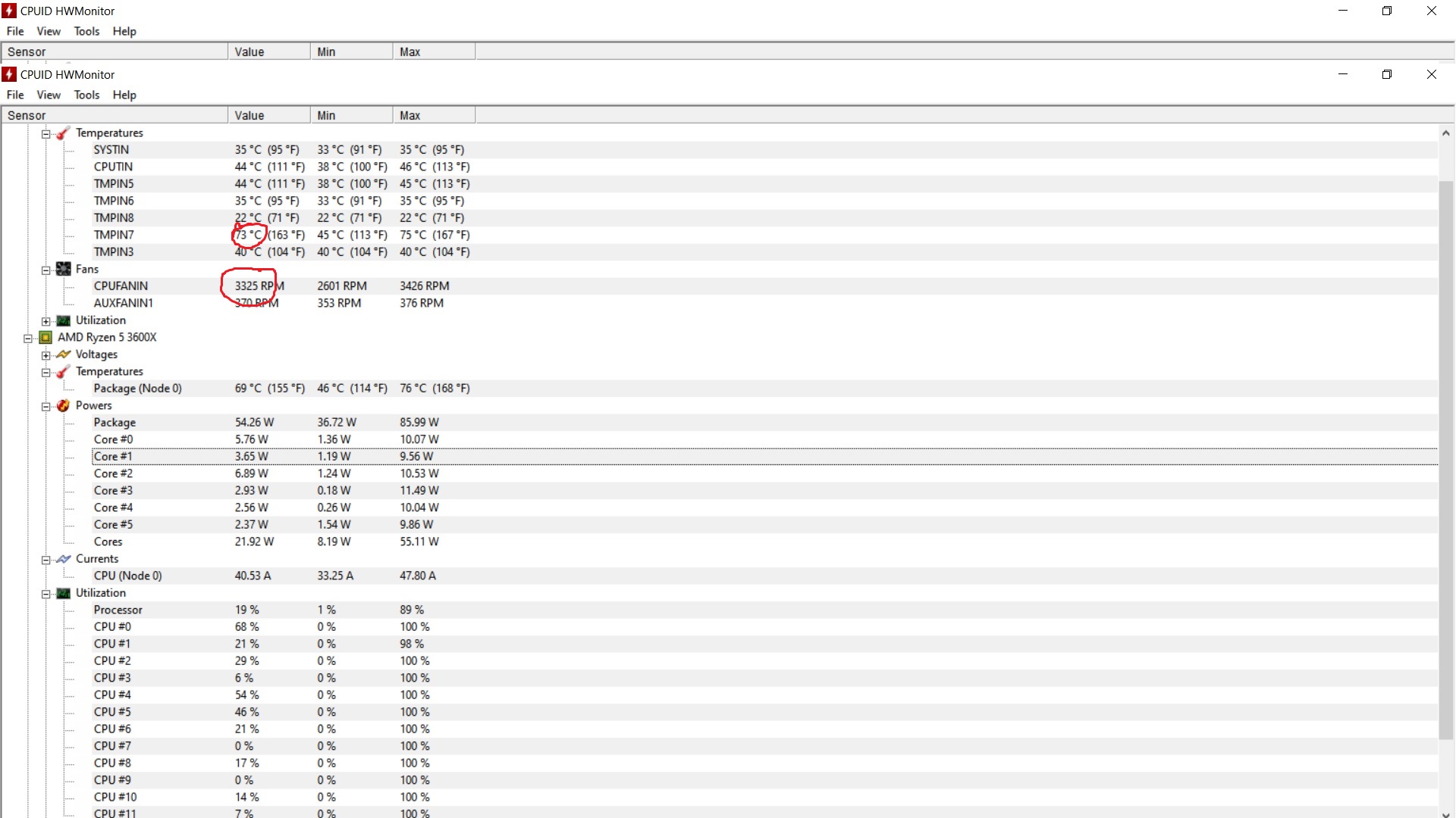 Mir ist von Anfang an aufgefallen dass der CPU fan auf Hochturen läuft und nachdem dann alle Treiber installiert waren, hab ich in HWMonitor gesehen dass ein Core besonders warm war (60° im vergleich zu den anderen 40°) . Zu diesem Zeitpunkt lief nur Firefox und ein download im Hintergrund. Der CPU Lüfter war konstant bei 3000RPM.