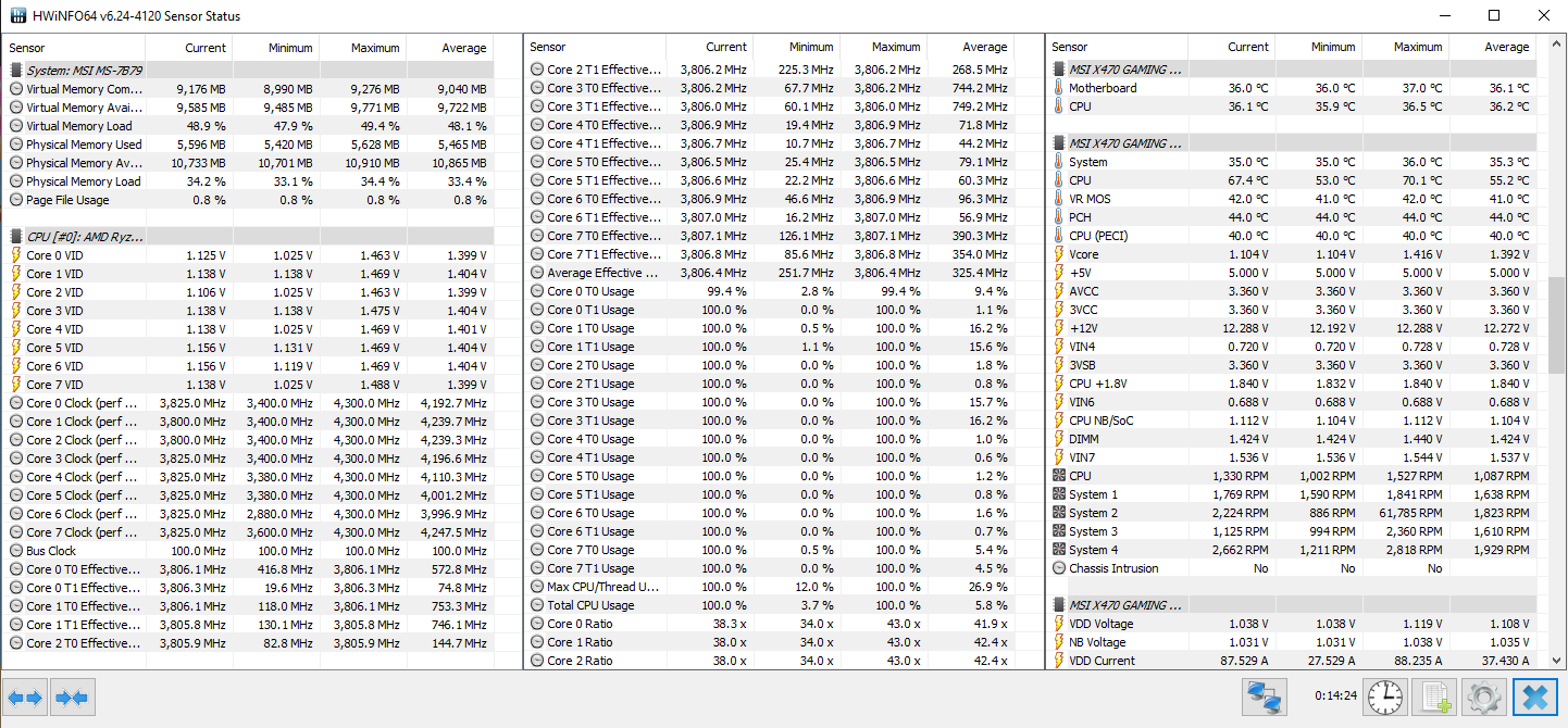 Mit PBO wird TDC auf 114A gehoben und ist trotzdem gemaxed. Temps sind fine (~70°C) Single Core boost ist 4,15 und Allcore 3,8.