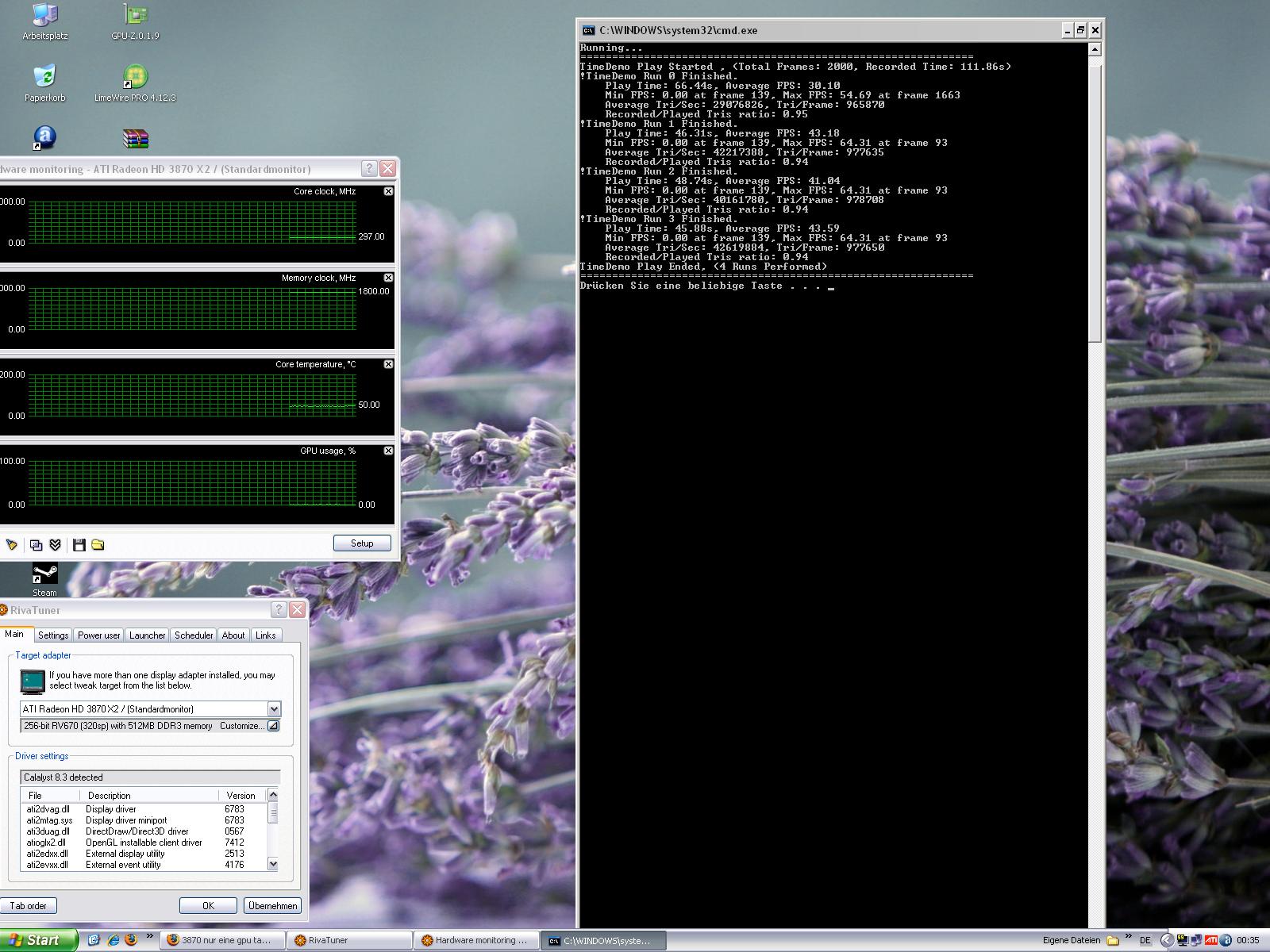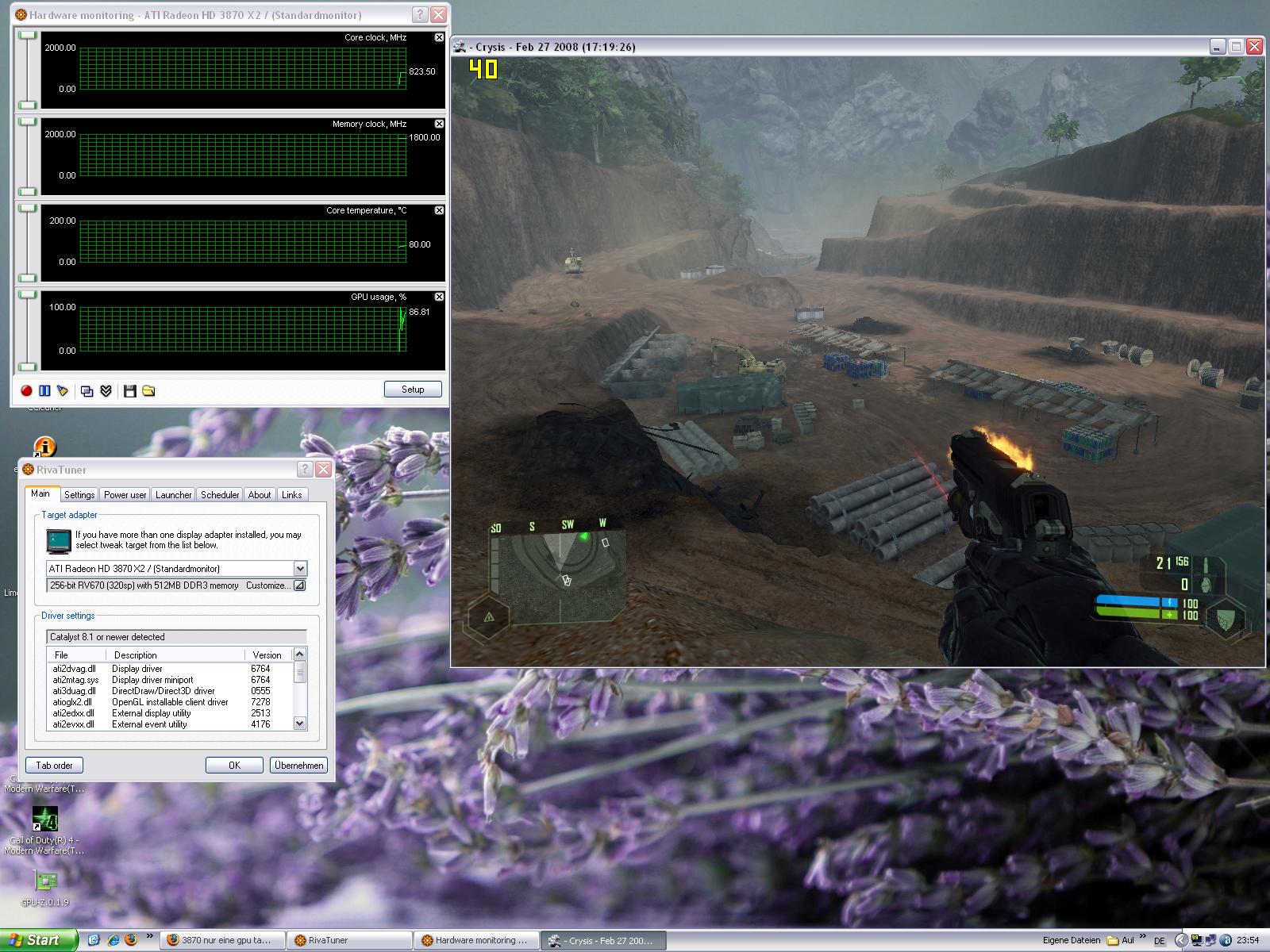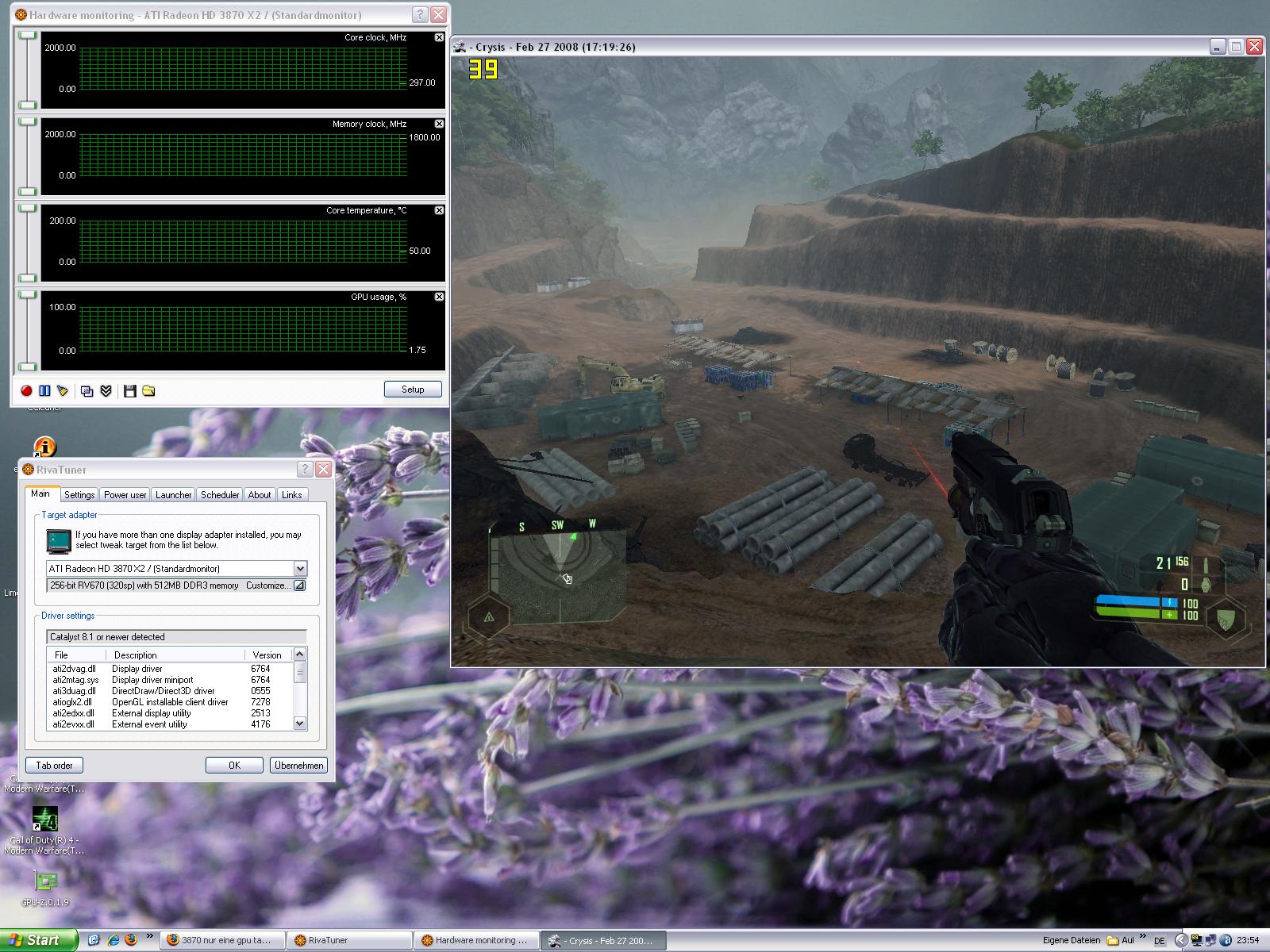 Hi und zwar habe ich mir vor 2 wochen eine ati radeon 3870 x2 gekauft im großen und ganzen bin ich ziemlich zufrieden mit der leistung wie wir alle wissen taktet die karte im 2d modus runter ungefähr 297 mhz beide gpu`s aber via riva tuner habe ich mal geschaut was die graka macht im 3d modus ok gpu 1 taktet hoch auf 825 mhz aber keider gottes bleibt gpu 2 auf den idle takt einstellungen und taktet sich nicht wie sein nachbar auf 825 mhz bin am verzweifeln hab schon in diversen foren mein prob gepostet aber nie eine hilfreiche antwort bekommen