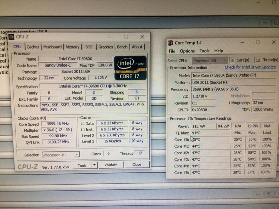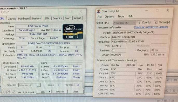 Doch seit gestern Abend übertaktete ich meine CPU um einiges aus Neugier, um zu schauen was die CPU so drauf hat und mir bei Spielen grundsätzlich an Leistung wiedergibt. Und ruck erzielte ich meine ersten erfolgreichen Werte, nämlich bei 1.25v lief die CPU bei 4.2GHz stabil(Cinebench, Prime95, RealBench, Resident Evil 7 und GTA V)(Abb. 2). Bei 4.3 GHz wiederum musste ich um +0.04v erhöhen, so dass dieser bei 1.29v stabil lief(Abb. 3). So kam ich aber auch schnell an die erhöhten Temps schnell ran. Doch wollte die CPU auch nicht weiter an die Grenzen bringen, da Intel für die CPU max. 1.35v vorgibt, sowie Tcase von 66.8°C. Die Temps habe ich per CoreTemp ausgelesen, und ich weiss auch, das CoreTemp die Kerntemps anzeigt, diese wiederum dürfen/werden etwas(~5°C) wärmer als die CPU selber (sein). Dies bestätigt auch mein BIOS, dass da nämlich die CPU-Temp niedriger ist als die Kerntemps.