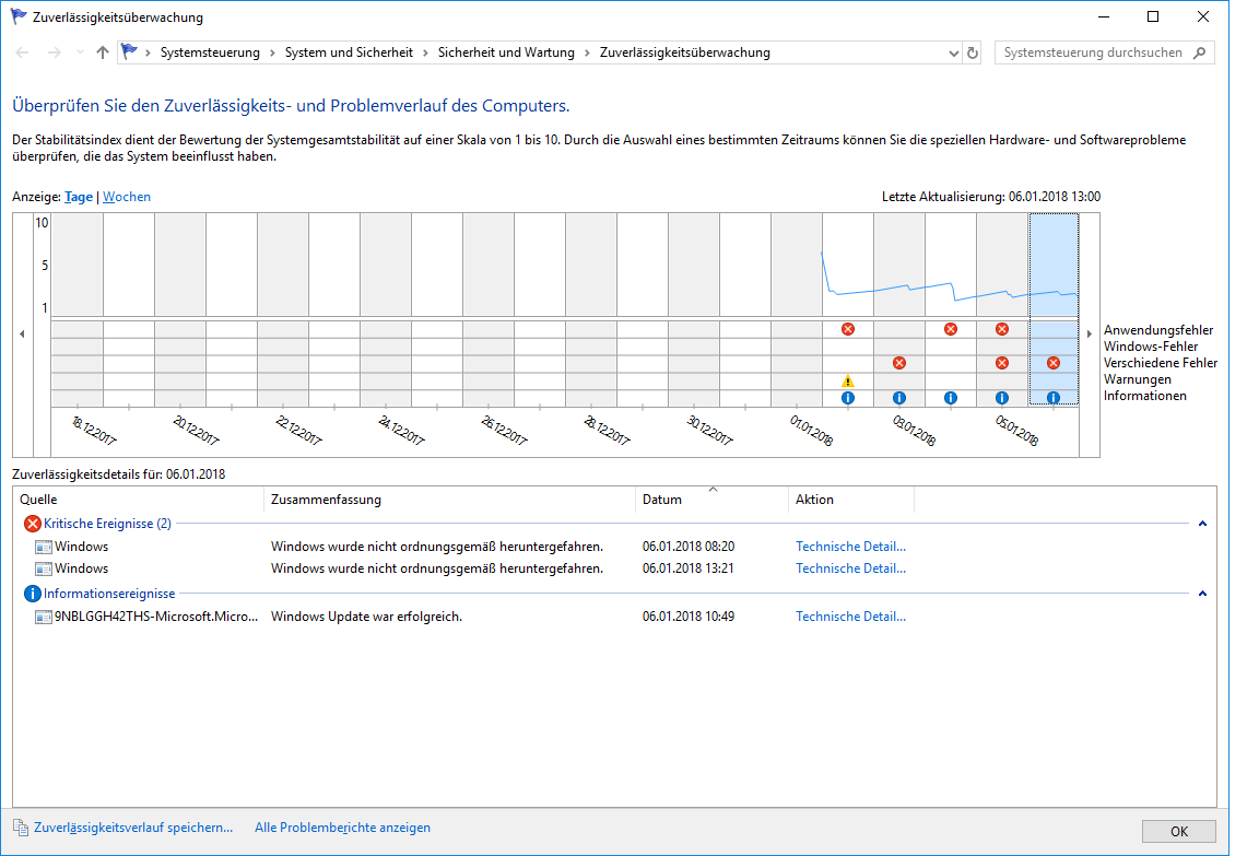 Fehler 2: Im Zuverlässigkeitsverlauf tauchen seit 2 Wochen immer wieder folgende Fehlermeldungen auf: *Das System wurde zuvor am xx.xx.2018 um xx:xx:xx Uhr unerwartet heruntergefahren.* Der PC wurde zu den vermerkten Zeitpunkten aber gar nicht heruntergefahren oder aber ganz normal über das Menü oder den Schalter ausgeschaltet.