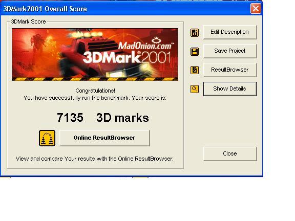 also ich komme auf 7676 3DMARKS 2001 - die 8000 schaffe ich auch noch (habe nicht viel rumexperimentiert - da ich auf dem System gerade am Artikel benchen bin, allerdings non OC und kein Bock habe, das ich mir das sys zerschiesse)