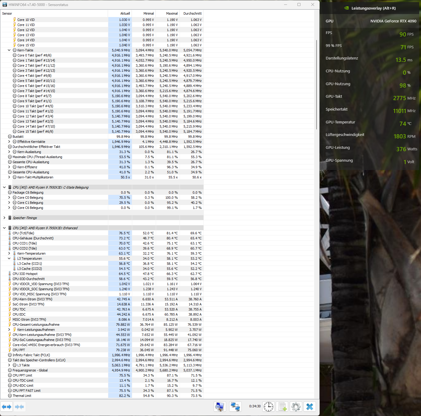 Da muss es aber einiges schief laufen um auf >100 W im idle-Betrieb zu kommen. Aus der Steckdose kann ich nicht dienen, aber mit HWinfo während einer Cyberpunk Session. All das was du erwähnt hast läuft im Hintergrund mit. Der 7950X3D nimmt 76 Watt auf.till69 schrieb:Ein User hat hier schon >100W berichtet. Es bleibt abzuwarten, was die Wahrheit ist, wenn mal ein paar Hintergrunddienste laufen, bzw. alles installiert ist (Afterburner, Steam, Nvidia-Experience)