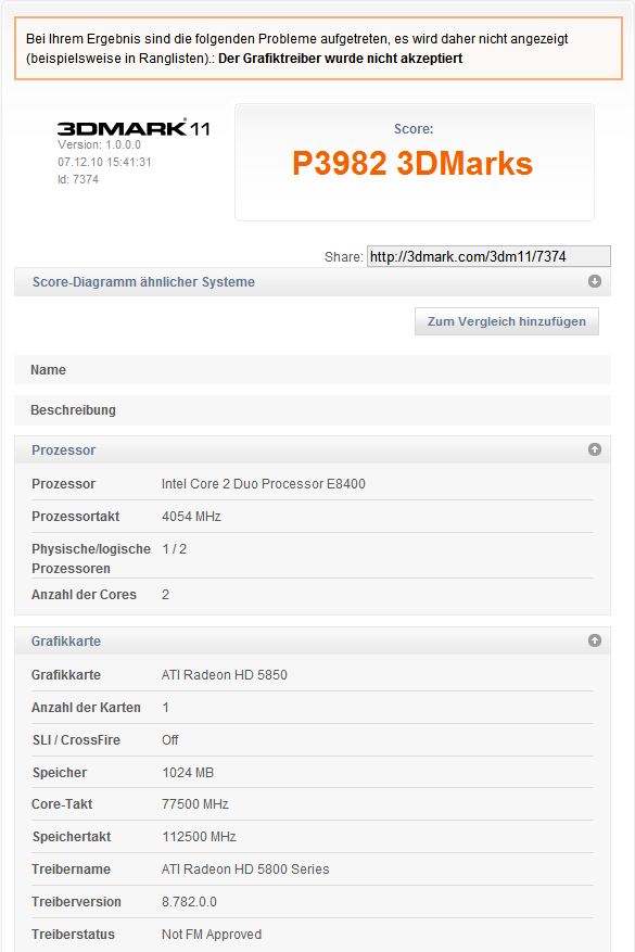 bei mir kam folgender text auf:Bei Ihrem Ergebnis sind die folgenden Probleme aufgetreten, es wird daher nicht angezeigt (beispielsweise in Ranglisten).: Der Grafiktreiber wurde nicht akzeptiert