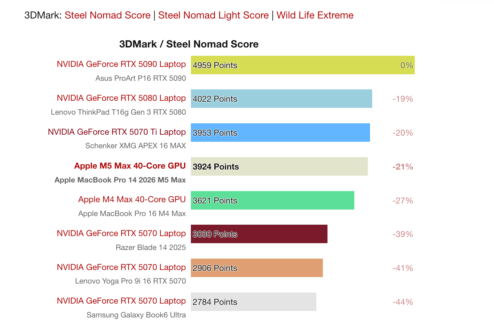 Test3DMark & Cyberpunk 2077: Apple M5 Max vs. Nvidia RTX 5070 & RTX 4090 Laptop GPU