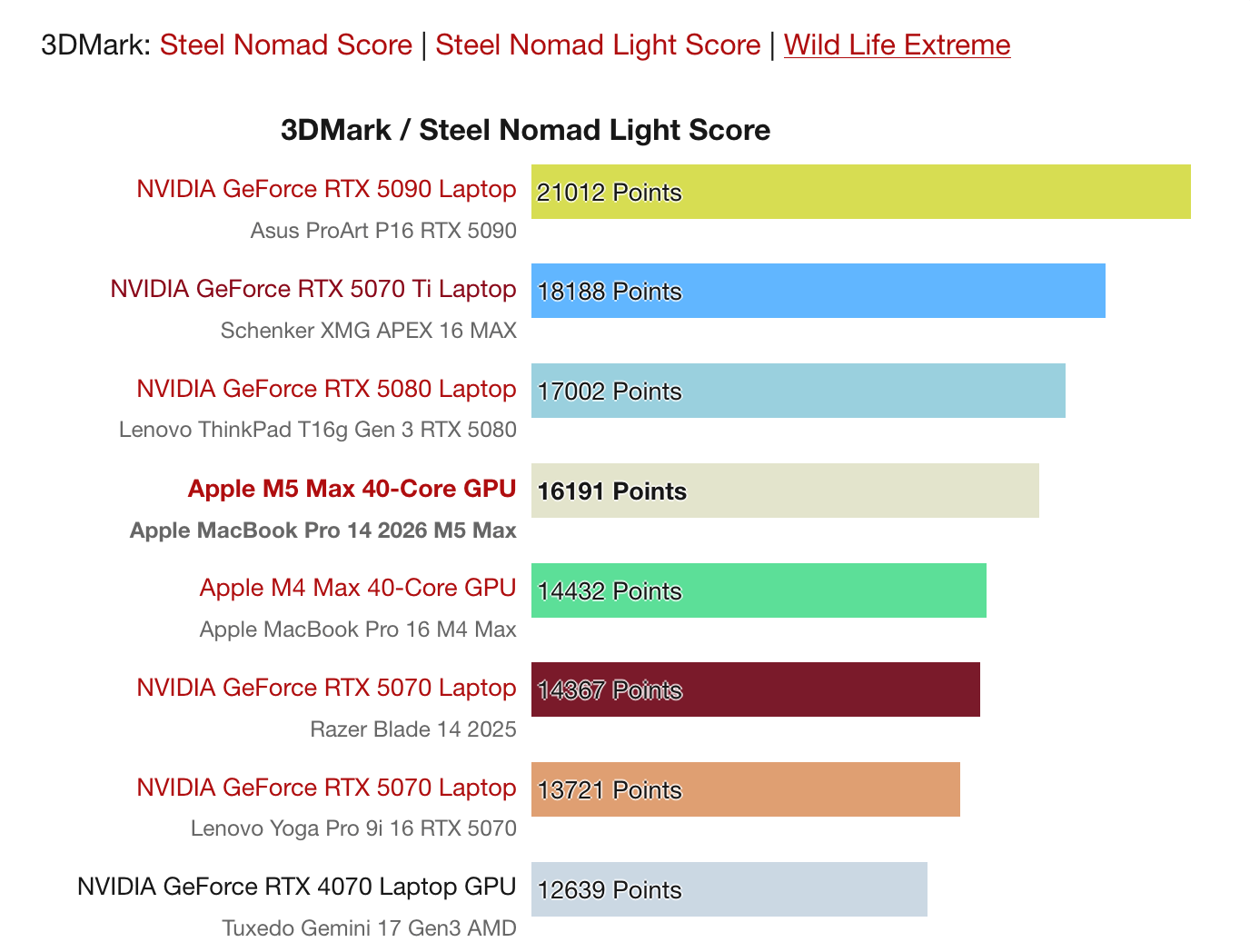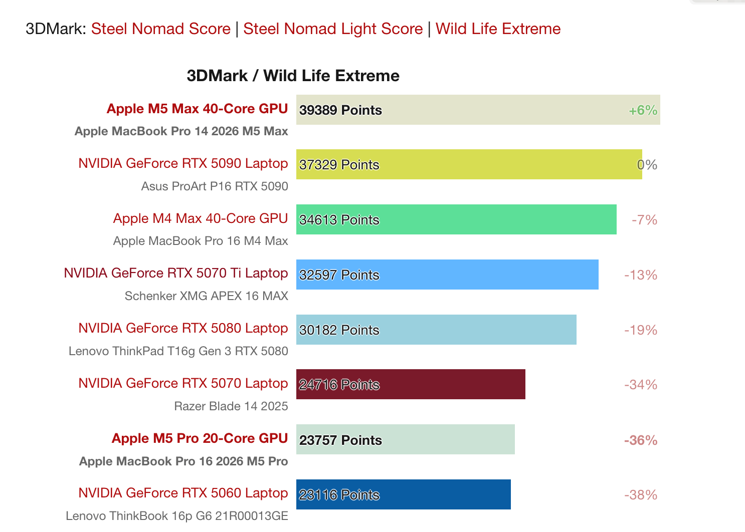 Also meines Wissens nach können die Top-Konfigurationen die Leistung unter Dauervolllast nicht halten und sie sind dafür auch nicht sonderlich leise. Möglich, dass Notebooks mit top dGPU noch lauter werden, aber die lassen den M5 auch im Staub zurück.