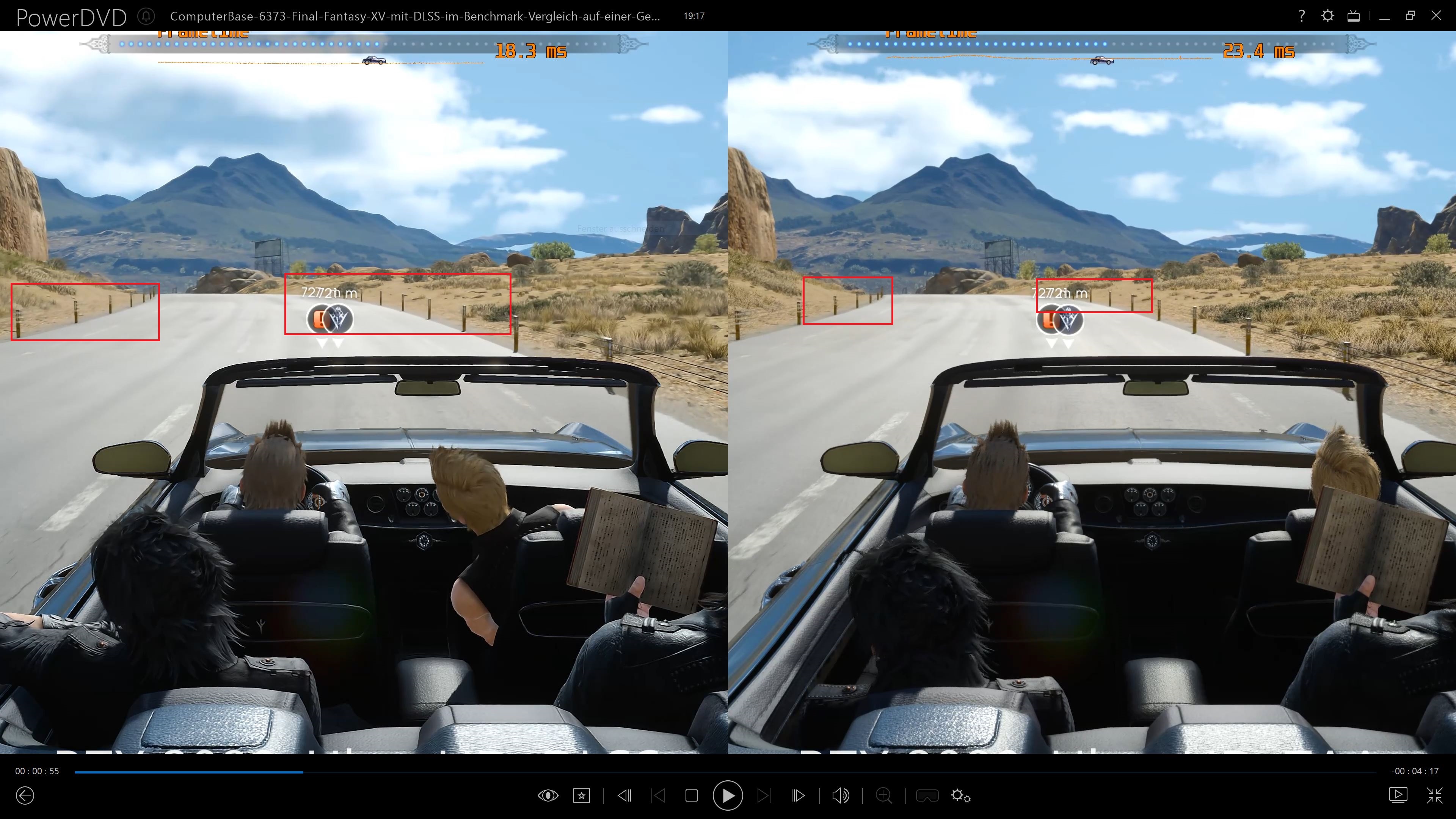 Bestimmte Sachen wie z.B. die durchlaufenden Kanten bei der Sonnenblende der Karre oder die überzeichneten Konturen fielen mir bereits beim ersten Durchlauf auf weil sie einem durch die Bewegung an sich oder die harten Kontraste praktisch is Auge springen. Andere Punkte wie diverse kaputte Texturen auf der Straße oder die kaputten Konzuren der Vegetation schob ich anfangs eher auf einen Fehler durch Kompressionsverlußte bei der Erstellung der Videos. Nachdem dazu aber keine Rückmeldung kam rechnete ich die Punkte ebenfalls DLSS zu.