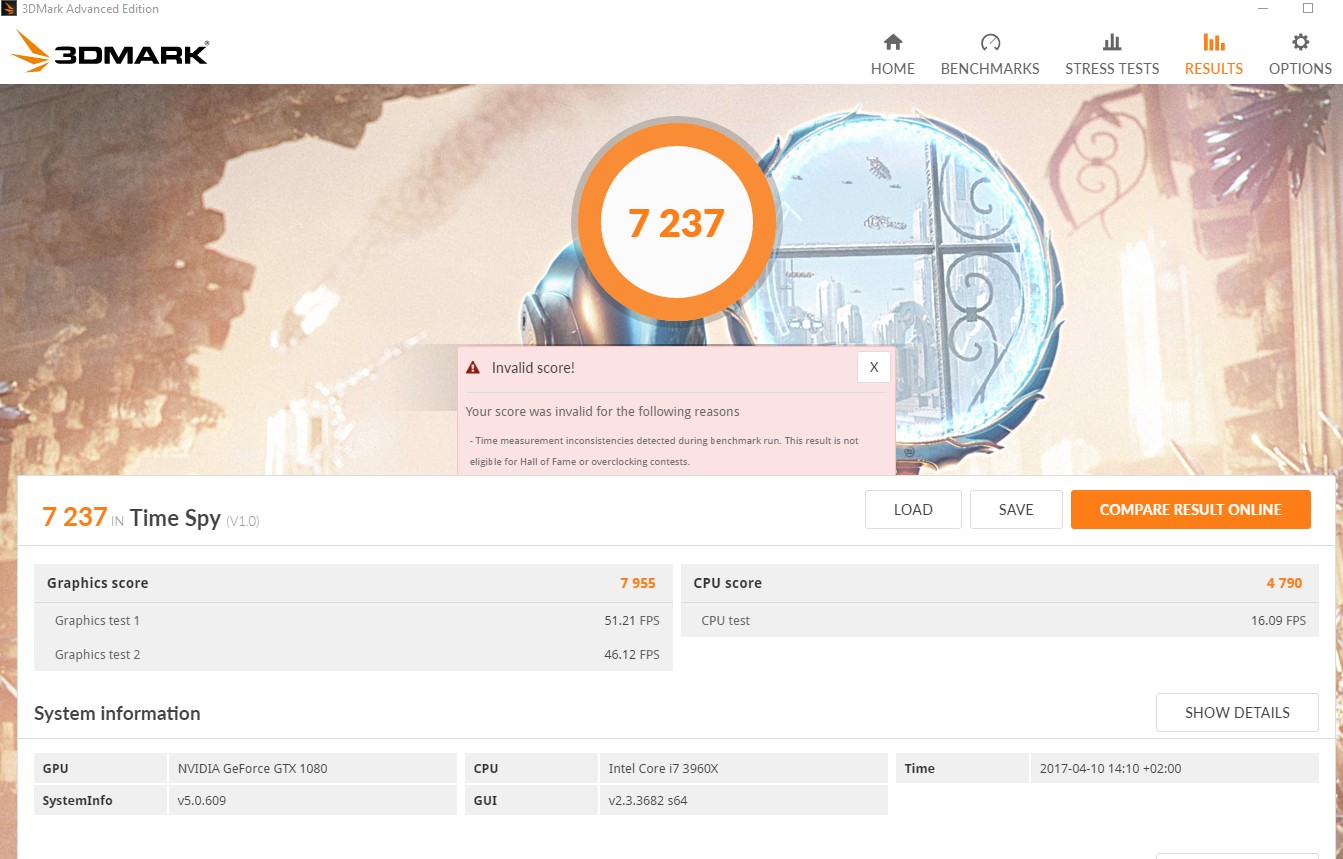 - Time measurement inconsistencies detected during benchmark run. This result is not eligible for Hall of Fame or overclocking contests.
