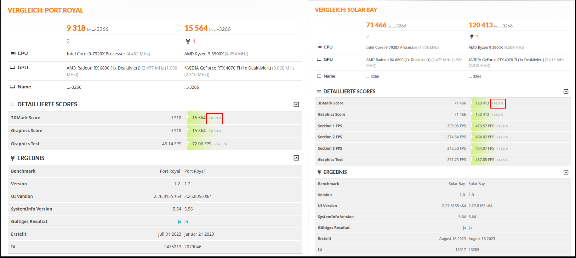 Die RX 6800 und die RTX 4070TI haben hier den selben Leistungsunterschied. Im reinen Raytracing Test ist die RTX 4070Ti über 2 1/2 mal so fix.