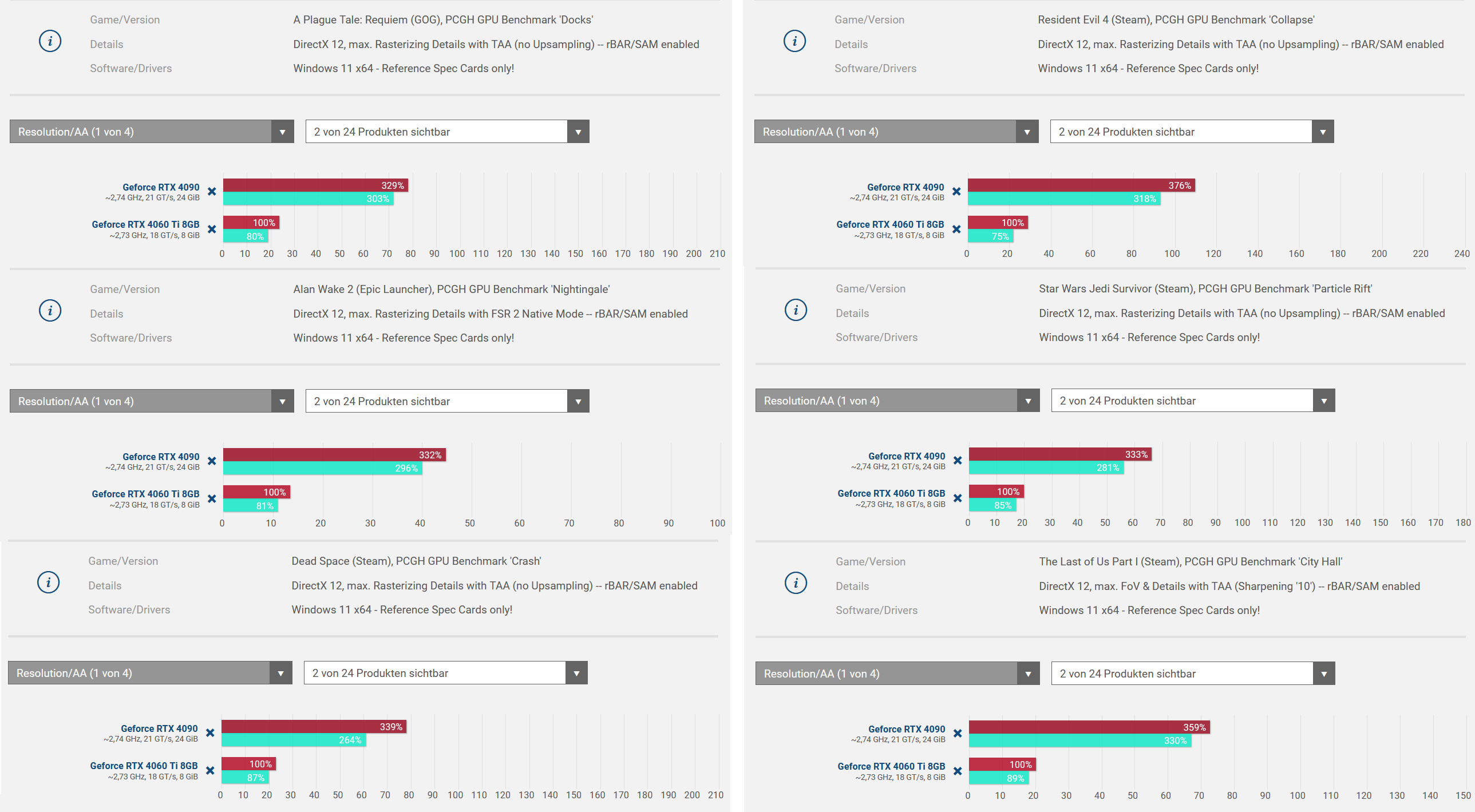 Hier sind noch ein paar Rasterizing-Einzelspiele, bei denen das Leistungsniveau der 4090 gegenüber der 4060 Ti bereits 329 - 376% beträgt... gegenüber der 3060 Ti wären das ca. 350 - 400%: