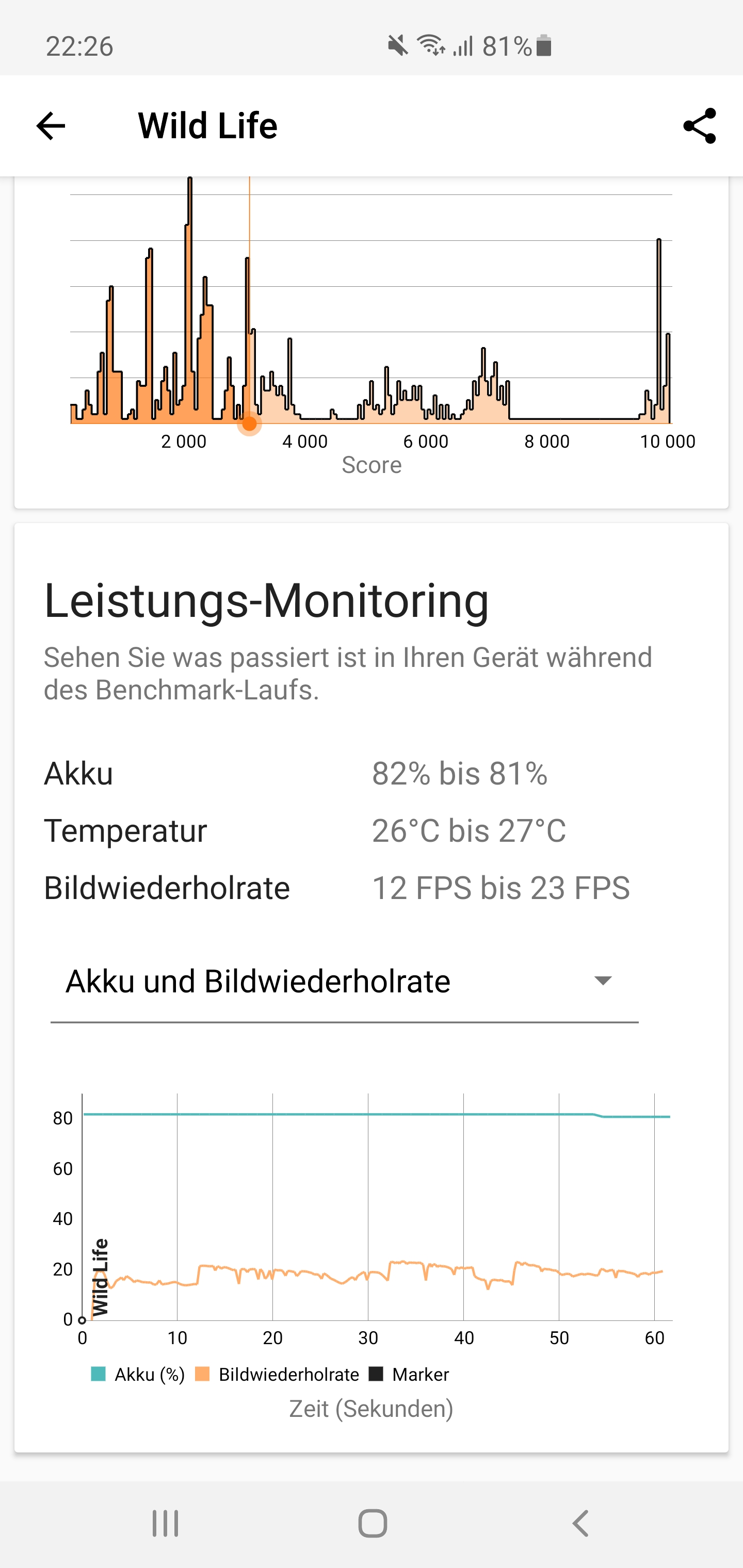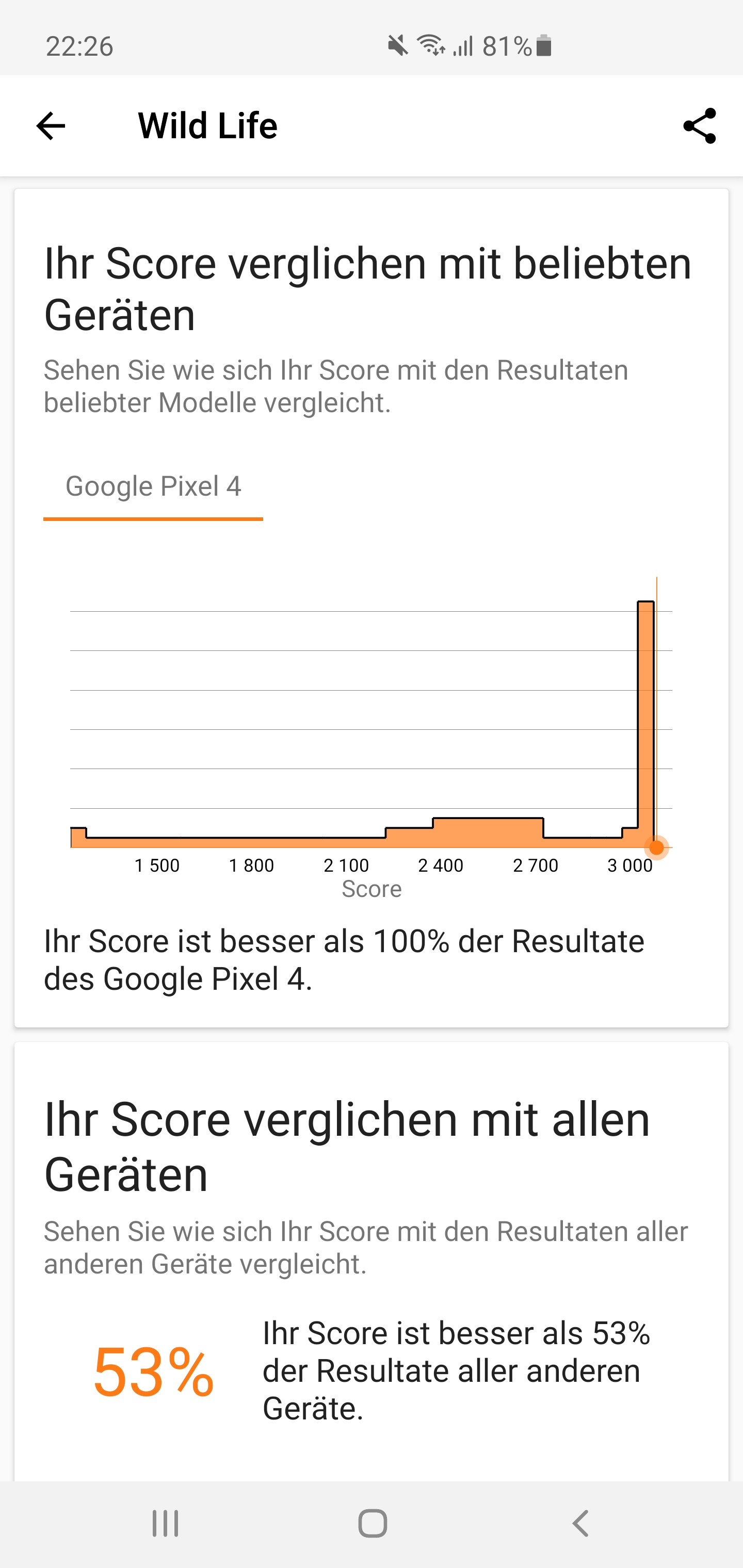 Ich bekam 432 punkte und circa 2.5 FPS im Durchschnitt. Ab und zu mal abgeschmiert. Das war 3DMark Wild Life auf meinem Nokia 7 Plus mit Android 10.