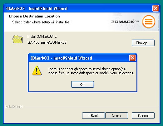 bei der Inatll kommt immer folgender Fehler (s. Bild). Ich habe auf C: 300MB frei, mein Pagefile ist auf 256MB fest eingestellt und der freie Speicher beträgt auf D: 1GB, G: 2GB.