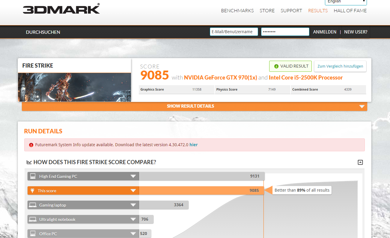 Ein bisschen Memory-OC brachte meinen Score von 89xx auf über 9000. Lustigerweise ist aber der Unterschied zwischen 6400MHz VRAM Takt und 7000MHz VRAM Takt gleich Null (resp. knapp 30 Punkte im Fire Strike). Wie kommts?