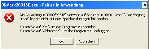 Als ich das letzte mal den den 3DMark2001 starten wollte, kam beiliegende Fehlermeldung. Früher lief der Benchmark ohne Probleme. Der 3DMark03 läuft weiterhin ohne Probleme. Neuinstallation half nichts und die neusten Treiber habe ich auch drauf.