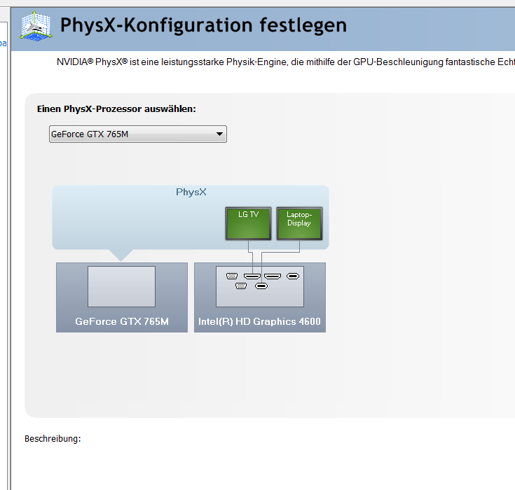 Leider erkennt der 3DTV Play Treiber bei der Installation keinen 3D Fernseher. Diesen habe ich per HDMI angeschlossen und den Desktop gespiegelt. Der Support von NVidia meinte, dass der Fernseher an der internen Grafikkarte Intel HD 4600 hängt und deshalb der Fernseher nicht erkannt wird. Dies sehe ich so auch in der NVidia Systemsteuerung.