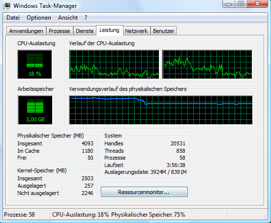 Allerdings habe ich nach einiger Zeit extremere Werte. Nach ein paar Stunden Call of Duty 5 und CS:S (nur mal als Beispiel) sind dann mal eben 3GB Ram (75%) belegt und die Auslagerungsdatei ist 4GB groß, obwohl nur noch ICQ und Firefox laufen.