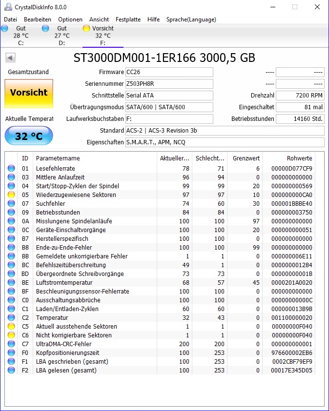 Nachdem ich verschiedene Dateien auf externe Festplatten ziehen wollte und hauptsächlich mit 400kb/s kopiert habe, hab ich befürchtet sie ist gerade am verrecken.