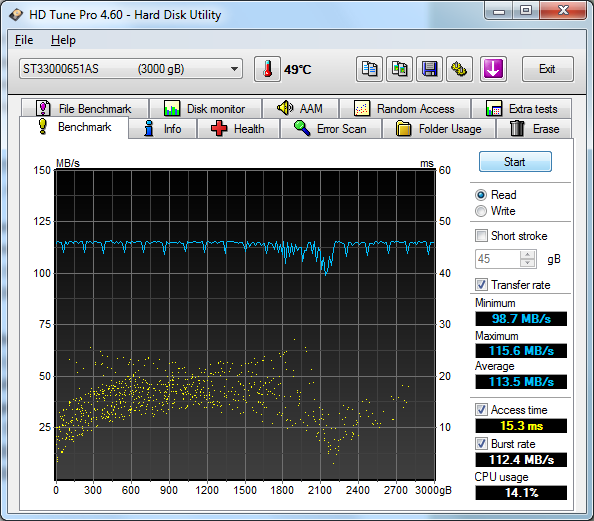 Allerdings konnte man das Problem bei der CnMemory HDD schon viel leichter erahnen, und zwar mit HD Tune. Beim Test sah man nämlich nach der 2TiB grenze wie die Zugriffszeit statt zu steigen Plötzlich wieder so niedrig war wie am anfang. Auch die geschwindigkeit stieg wieder an, auch wenn hier nicht gut zu sehen, da der USB 3.0 Controller hier limitierte.